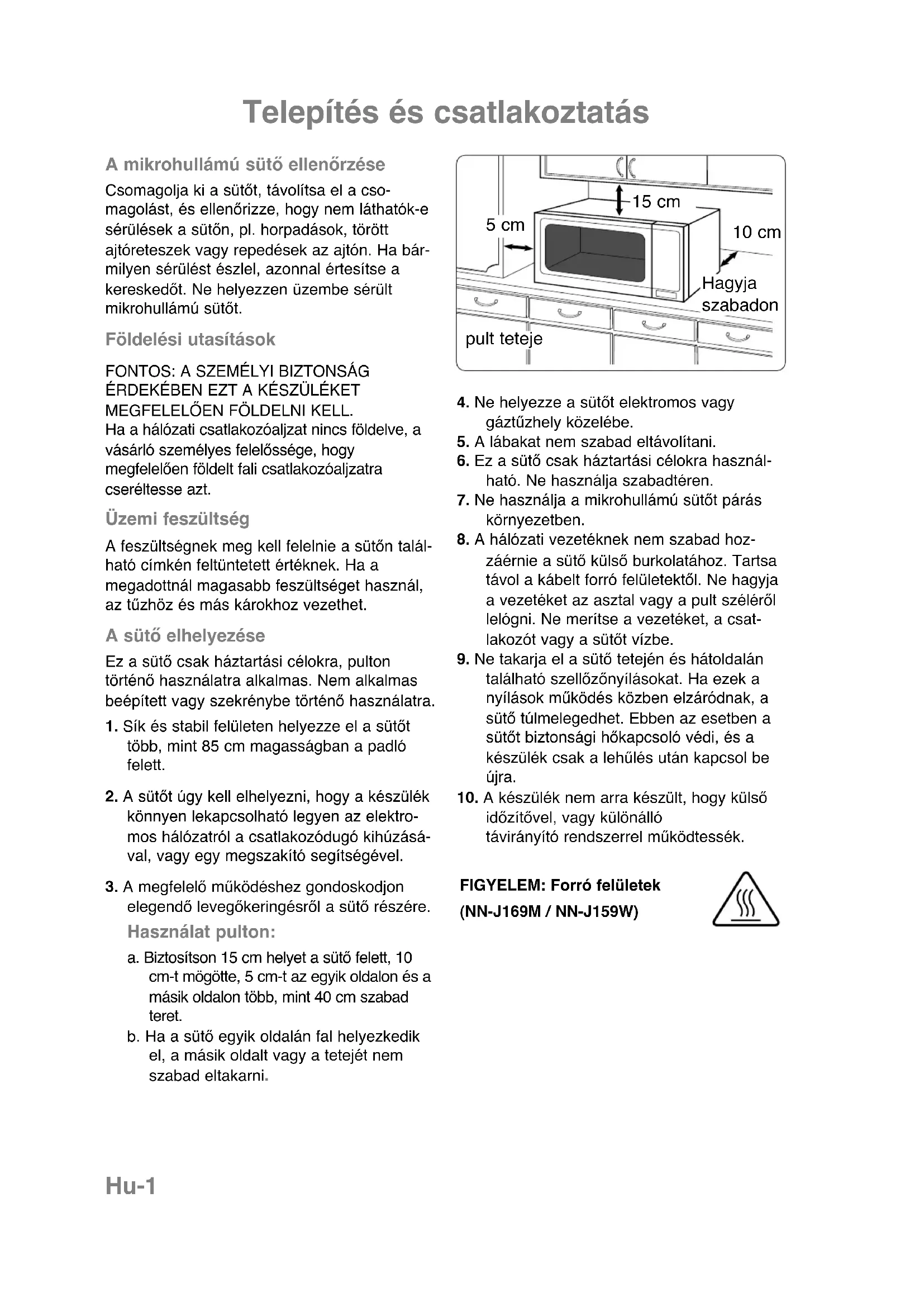 időzítővel, vagy különálló távirányító rendszerrel működtessék. pult teteje 5 cm 10 cm Hagyja szabadon 15 cm FIGYELEM: Forró felületek (NN-J169M / NN-J159W)Hu-2
