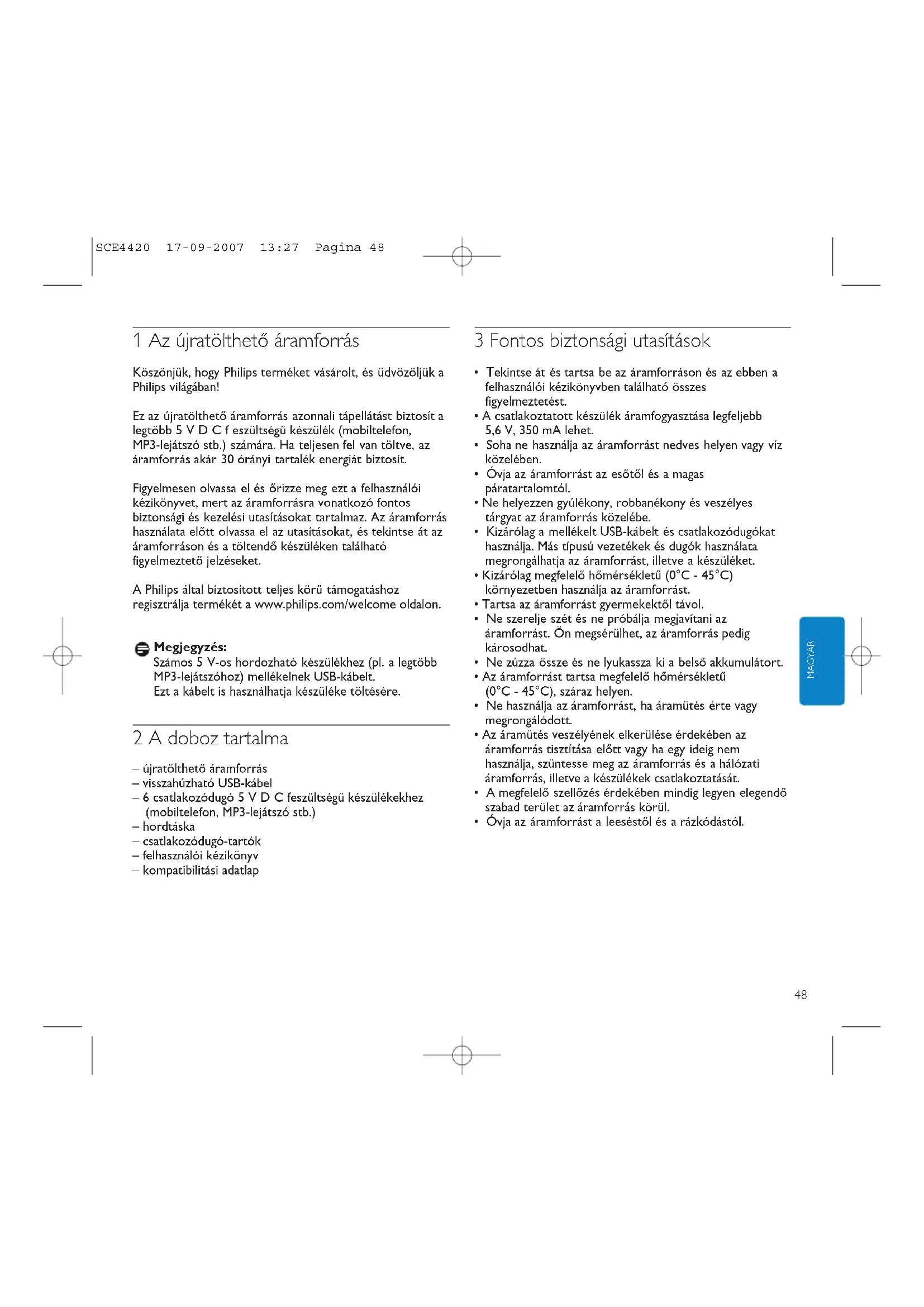 - Keď nastane nejaký problém s napájacou súpravou alebo príslušenstvom, zaneste adaptér a príslušenstvo k vášmu predajcovi. 9 Potrebujete pomoc? On-line pomoc: www.philips.com/welcome Pre interaktívnu pomoc a časté otázky. SCE4420 17-09-2007 13:27 Pagina 4748 MAGYAR 1 Az újratölthető áramforrás Köszönjük, hogy Philips terméket vásárolt, és üdvözöljük a Philips világában! Ez az újratölthető áramforrás azonnali tápellátást biztosít a legtöbb5VDCfeszültségű készülék (mobiltelefon, MP3-lejátszó stb.) számára. Ha teljesen fel van töltve, az áramforrás akár 30 órányi tartalék energiát biztosít. Figyelmesen olvassa el és őrizze meg ezt a felhasználói kézikönyvet, mert az áramforrásra vonatkozó fontos biztonsági és kezelési utasításokat tartalmaz. Az áramforrás használata előtt olvassa el az utasításokat, és tekintse át az áramforráson és a töltendő készüléken található figyelmeztető jelzéseket. A Philips által biztosított teljes körű támogatáshoz regisztrálja termékét a www.philips.com/welcome oldalon. Megjegyzés: Számos 5 V-os hordozható készülékhez (pl. a legtöbb MP3-lejátszóhoz) mellékelnek USB-kábelt. Ezt a kábelt is használhatja készüléke töltésére. 2 A doboz tartalma – újratölthető áramforrás – visszahúzható USB-kábel – 6 csatlakozódugó5VDCfeszültségű készülékekhez (mobiltelefon, MP3-lejátszó stb.) – hordtáska – csatlakozódugó-tartók – felhasználói kézikönyv – kompatibilitási adatlap 3 Fontos biztonsági utasítások