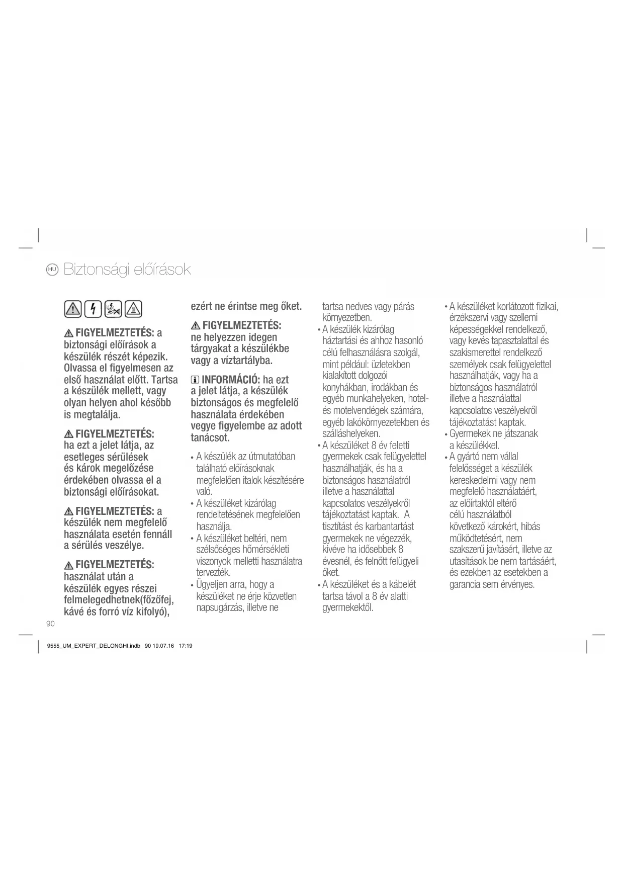 9555_UM_EXPERT_DELONGHI.indb 89 19.07.16 17:19FIGYELMEZTETÉS: a biztonsági előírások a készülék részét képezik. Olvassa el figyelmesen az első használat előtt. Tartsa a készülék mellett, vagy olyan helyen ahol később is megtalálja. FIGYELMEZTETÉS: ha ezt a jelet látja, az esetleges sérülések és károk megelőzése érdekében olvassa el a biztonsági előírásokat. FIGYELMEZTETÉS: a készülék nem megfelelő használata esetén fennáll a sérülés veszélye. FIGYELMEZTETÉS: használat után a készülék egyes részei felmelegedhetnek(főzőfej, kávé és forró víz kifolyó), ezért ne érintse meg őket. FIGYELMEZTETÉS: ne helyezzen idegen tárgyakat a készülékbe vagy a víztartályba. INFORMÁCIÓ: ha ezt a jelet látja, a készülék biztonságos és megfelelő használata érdekében vegye figyelembe az adott tanácsot.