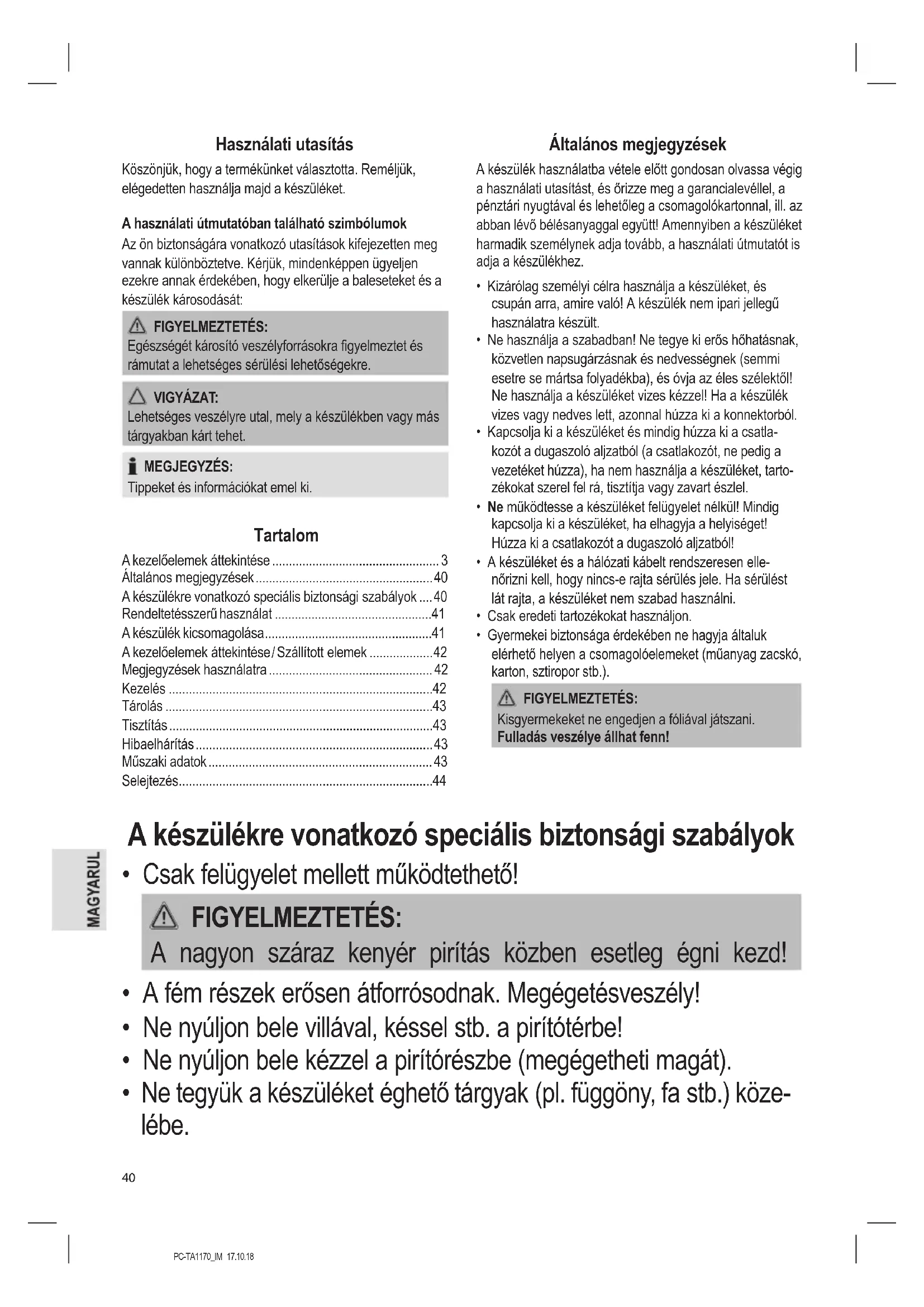 - Csak felügyelet mellett működtethető! FIGYELMEZTETÉS: A nagyon száraz kenyér pirítás közben esetleg égni kezd!