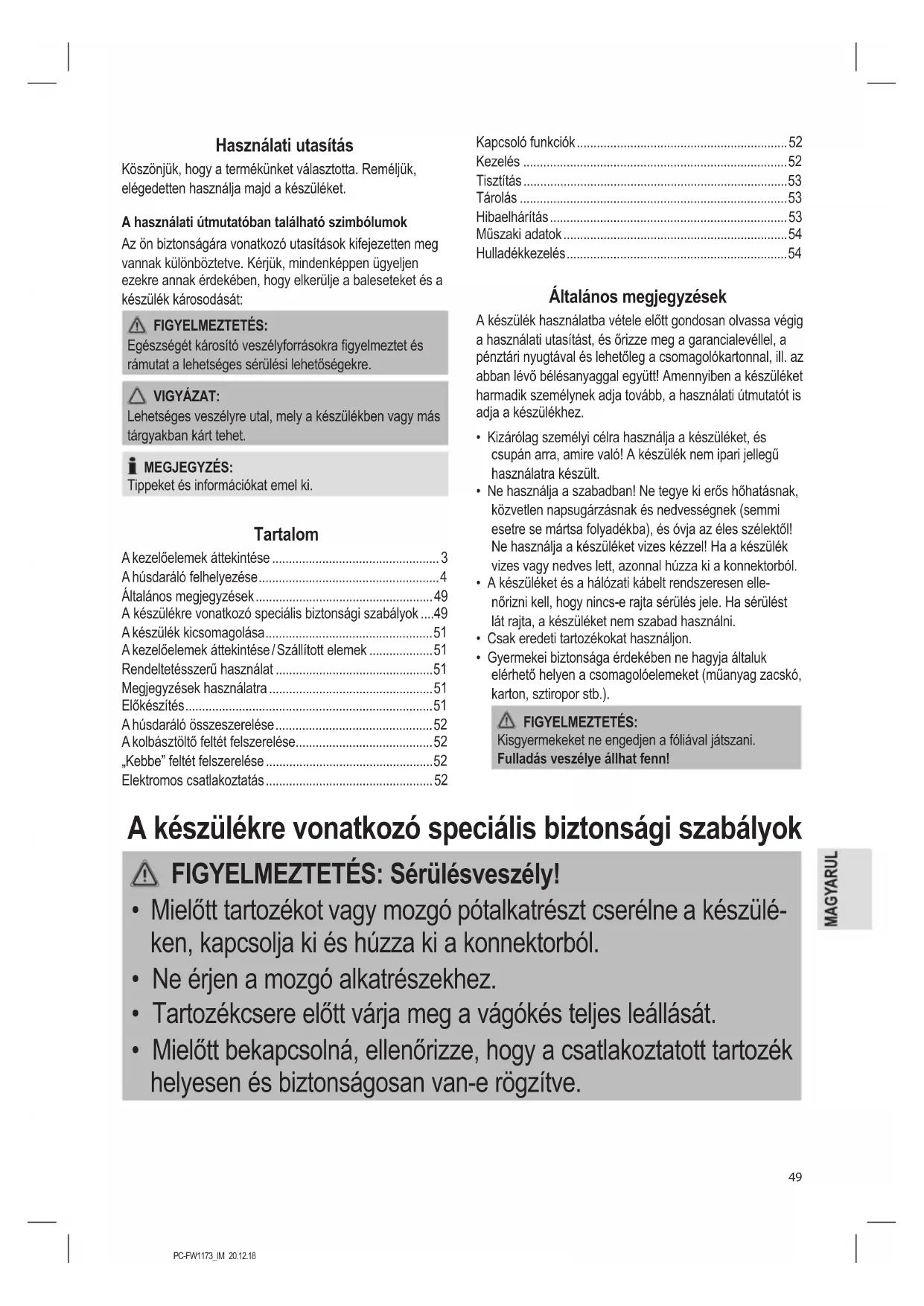 - A készülékre vonatkozó speciális biztonsági szabályok p. 49