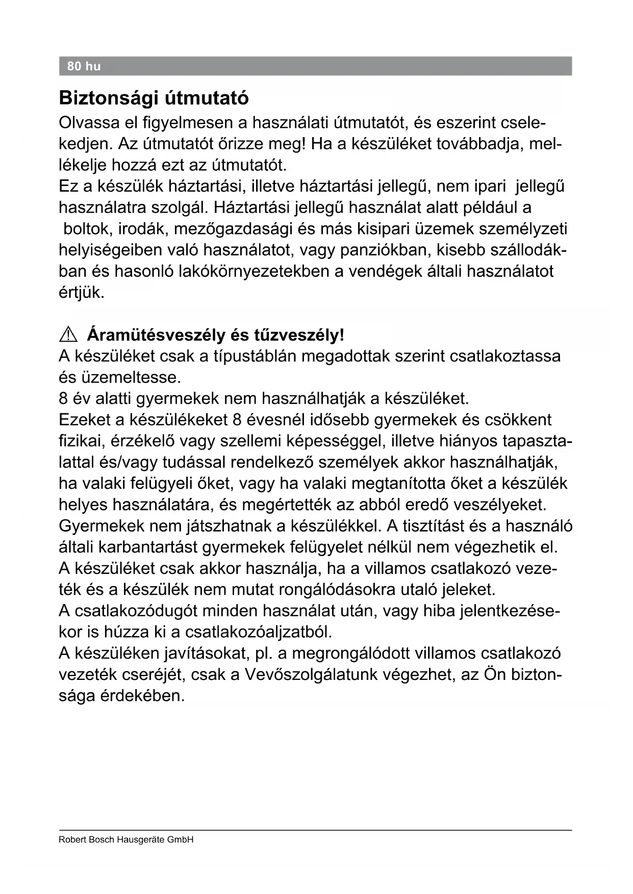 Áramütésveszély és tűzveszély! A készüléket csak a típustáblán megadottak szerint csatlakoztassa és üzemeltesse. 8 év alatti gyermekek nem használhatják a készüléket. Ezeket a készülékeket 8 évesnél idősebb gyermekek és csökkent zikai, érzékelő vagy szellemi képességgel, illetve hiányos tapaszta- lattal és/vagy tudással rendelkező személyek akkor használhatják, ha valaki felügyeli őket, vagy ha valaki megtanította őket a készülék helyes használatára, és megértették az abból eredő veszélyeket. Gyermekek nem játszhatnak a készülékkel. A tisztítást és a használó általi karbantartást gyermekek felügyelet nélkül nem végezhetik el. A készüléket csak akkor használja, ha a villamos csatlakozó veze- ték és a készülék nem mutat rongálódásokra utaló jeleket. A csatlakozódugót minden használat után, vagy hiba jelentkezése- kor is húzza ki a csatlakozóaljzatból. A készüléken javításokat, pl. a megrongálódott villamos csatlakozó vezeték cseréjét, csak a Vevőszolgálatunk végezhet, az Ön bizton- sága érdekében.81 PHS 9460 02/2013 81hu A vezetéket ● ne érintse hozzá forró tárgyakhoz, ● ne húzza végig éles széleken, ● ne használja hordozó fogantyúként. A tisztítás előtt a hálózati csatlakozódugót húzza ki. A készüléket soha ne merítse vízbe. Gőzölő tisztítókészüléket ne használjon. A fűtőlapok átforrósodnak. A készüléket csak a fogantyújánál fogva tartsa. Csak száraz hajon használja, műhajon semmiképpen se használja. A készüléket csak hőre nem érzékeny felületre rakja le. Vízzel teli kád, mosóteknő vagy egyéb edények közelében ne használja a készüléket.