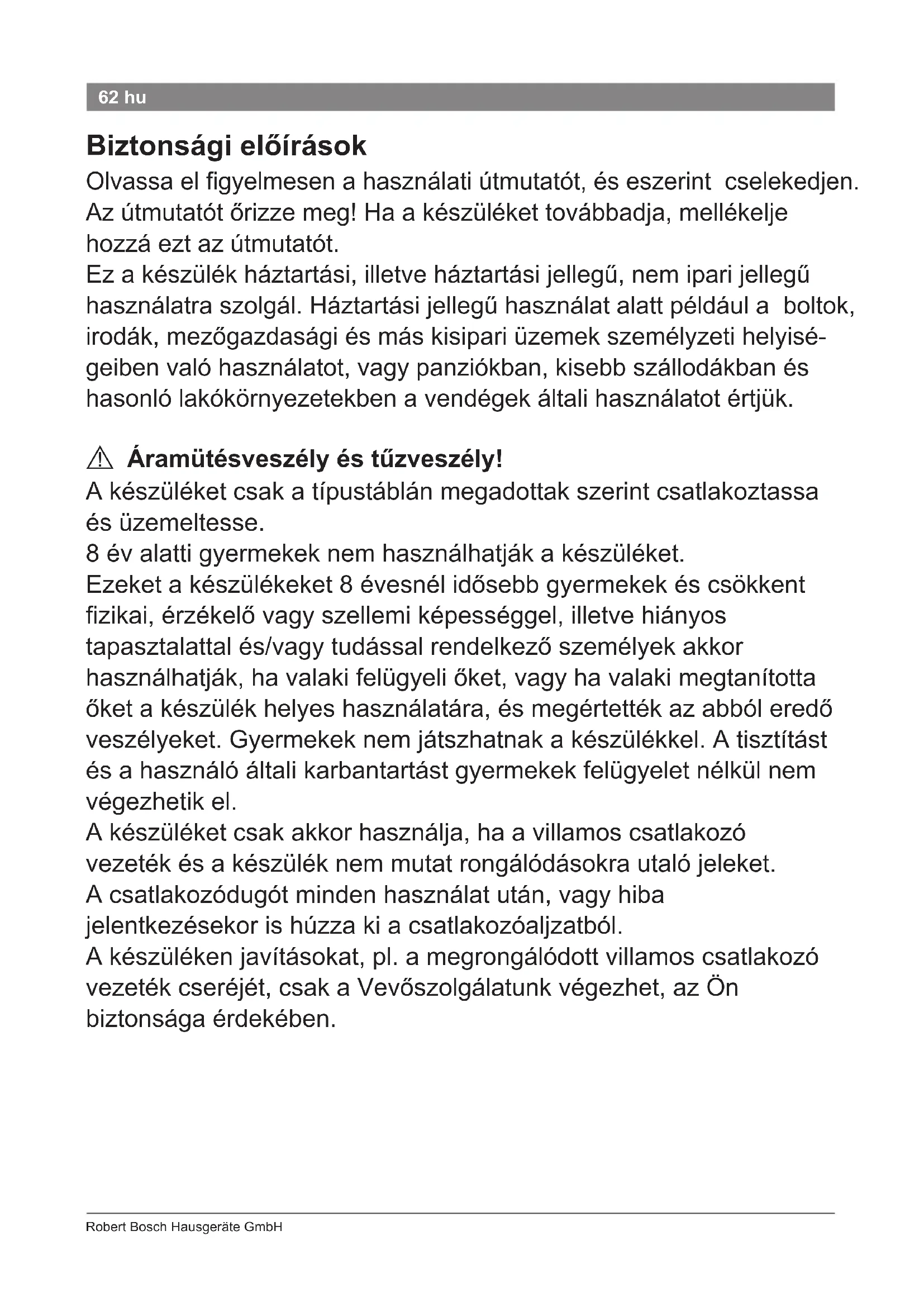 Áramütés veszély! Tisztításelőtthúzzakiahálózaticsatlako- zódugót.Akészüléketsohasemerítse vízbe.Gőzölőtisztítókészüléketnehasz- náljon. ●Akészülékkülsejétnedvesruhávaltörölje le.Élesvagysúrolóhatásútisztítószert nealkalmazzon. ●Alevegőbeömlőrácsot6puhaecsettel rendszeresentisztítsameg. ●Vegyele,éstisztítsamegakörkefét. Csakakkorhasználjaújra,hateljesen megszáradt. Tárolás Akészülékettároláselőtthagyjakihűlni. Műszaki adatok Elektromoscsatlakozás (feszültség/frekvencia) 220-240V 50Hz Teljesítmény 700W Ártalmatlanítás Acsomagolástkörnyezetbarátmódon ártalmatlanítsa.Akészüléketazelektromos éselektronikaihulladékok(wasteelectrical andelectronicequipment–WEEE) kezelésérőlszóló2002/96/EGjelűeurópai irányelvnekmegfelelőenjelöltükmeg.Az irányelvfoglaljakeretbeahulladéknak számítókészülékekvisszavételétés hasznosítását.Ajelenleghasználatos ártalmatlanításimódokrólérdeklődjöna szakkereskedésben. Garanciális feltételek Agaranciálisfeltételeketa151/2003. (IX.22.)számúkormányrendeletszabá- lyozza.72óránbelülimeghibásodásesetén akészüléketakereskedőkicseréli.Ezu- tánvevőszolgálatunkgondoskodikalehető legrövidebbidőnbelülijavításról.Agaran- ciálisszolgáltatásokatavásárlásnálkapott, szabályosankitöltöttgaranciajeggyellehet igénybevenni,amelymindenegyébgaran- ciálisfeltételtisrészletesenismertet. Minőségtanúsítás:A2/1984.(111.10)BkM- IpMszámúrendeletealapján,mintfor- galmazótanúsítjuk,hogyakészüléka vásárlásitájékoztatóbanközöltadatoknak megfelel. Aváltoztatásokjogátfenntartjuk. A66 RobertBoschHausgeräteGmbH 66 uk Вказівки з техніки безпеки Інструкціюзексплуатаціїтребауважнопрочитати,діятивідносно довказівок,щомістятьсявній,ідобрезберігати! Передаючицейприладіншійлюдині,дайтеїйцюінструкцію. Данийприладпризначенийдлядомашньоговикористання, абодлявикористаннявнекомерційній,побутовійсереді. Побутовасередавключаєслужбовізонивмагазинах,офісах, сільськогосподарськихтаіншихмалихпідприємствах,атакож зонидлягостейвготеляхтипу„ночівлятасніданок“,малих готеляхтажитловихбудівляханалогічноготипу.