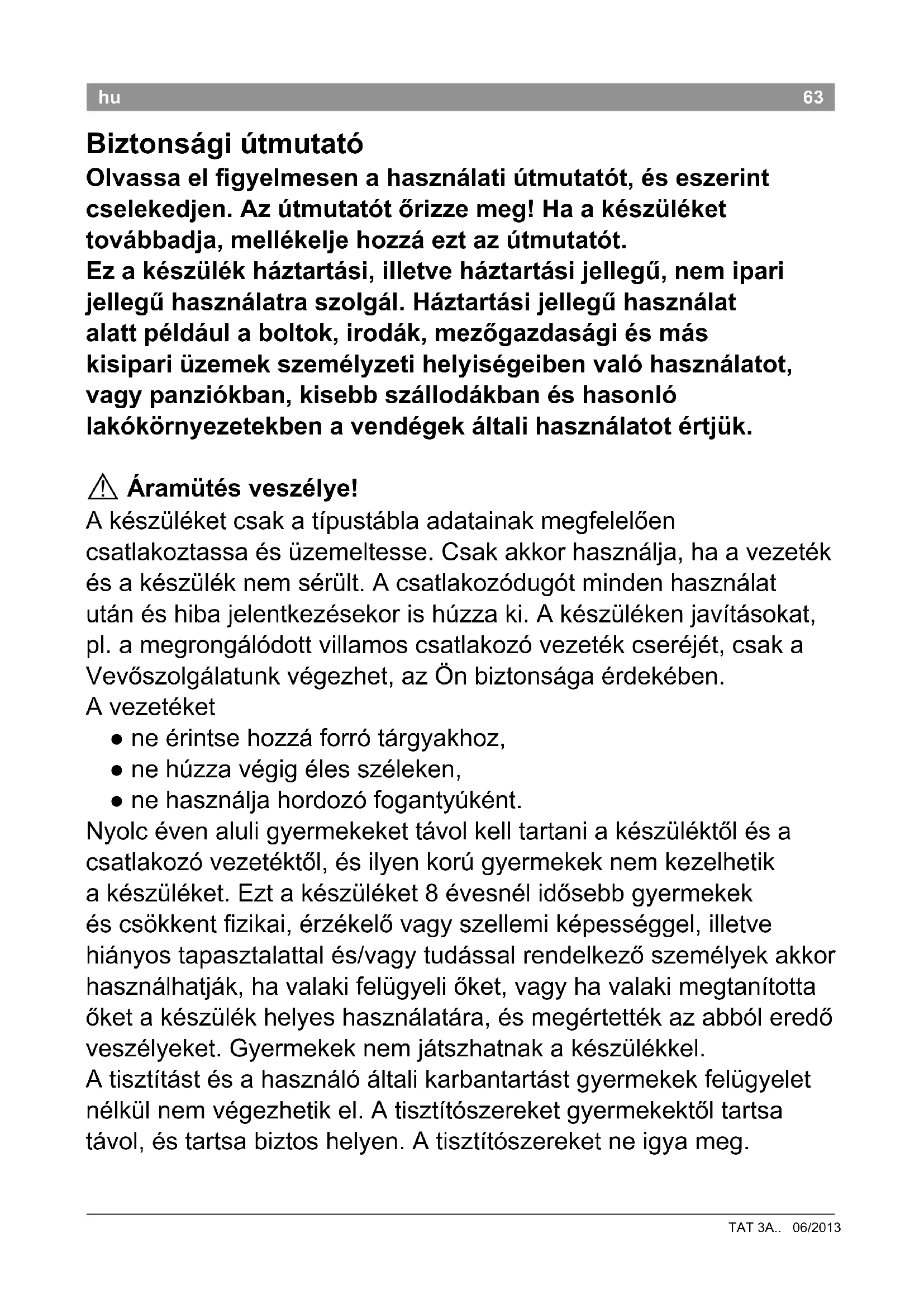 Biztonsági útmutató Olvassa el gyelmesen a használati útmutatót, és eszerint cselekedjen. Az útmutatót őrizze meg! Ha a készüléket továbbadja, mellékelje hozzá ezt az útmutatót. Ez a készülék háztartási, illetve háztartási jellegű, nem ipari jellegű használatra szolgál. Háztartási jellegű használat alatt például a boltok, irodák, mezőgazdasági és más kisipari üzemek személyzeti helyiségeiben való használatot, vagy panziókban, kisebb szállodákban és hasonló lakókörnyezetekben a vendégek általi használatot értjük.