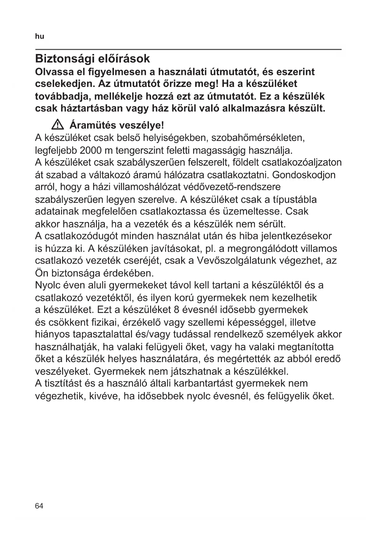 Biztonsági előírások Olvassa el gyelmesen a használati útmutatót, és eszerint cselekedjen. Az útmutatót őrizze meg! Ha a készüléket továbbadja, mellékelje hozzá ezt az útmutatót. Ez a készülék csak háztartásban vagy ház körül való alkalmazásra készült. W Áramütés veszélye! A készüléket csak belső helyiségekben, szobahőmérsékleten, legfeljebb 2000 m tengerszint feletti magasságig használja. A készüléket csak szabályszerűen felszerelt, földelt csatlakozóaljzaton át szabad a váltakozó áramú hálózatra csatlakoztatni. Gondoskodjon arról, hogy a házi villamoshálózat védővezető-rendszere szabályszerűen legyen szerelve. A készüléket csak a típustábla adatainak megfelelően csatlakoztassa és üzemeltesse. Csak akkor használja, ha a vezeték és a készülék nem sérült. A csatlakozódugót minden használat után és hiba jelentkezésekor is húzza ki. A készüléken javításokat, pl. a megrongálódott villamos csatlakozó vezeték cseréjét, csak a Vevőszolgálatunk végezhet, az Ön biztonsága érdekében. Nyolc éven aluli gyermekeket távol kell tartani a készüléktől és a csatlakozó vezetéktől, és ilyen korú gyermekek nem kezelhetik a készüléket. Ezt a készüléket 8 évesnél idősebb gyermekek és csökkent zikai, érzékelő vagy szellemi képességgel, illetve hiányos tapasztalattal és/vagy tudással rendelkező személyek akkor használhatják, ha valaki felügyeli őket, vagy ha valaki megtanította őket a készülék helyes használatára, és megértették az abból eredő veszélyeket. Gyermekek nem játszhatnak a készülékkel. A tisztítást és a használó általi karbantartást gyermekek nem végezhetik, kivéve, ha idősebbek nyolc évesnél, és felügyelik őket.65