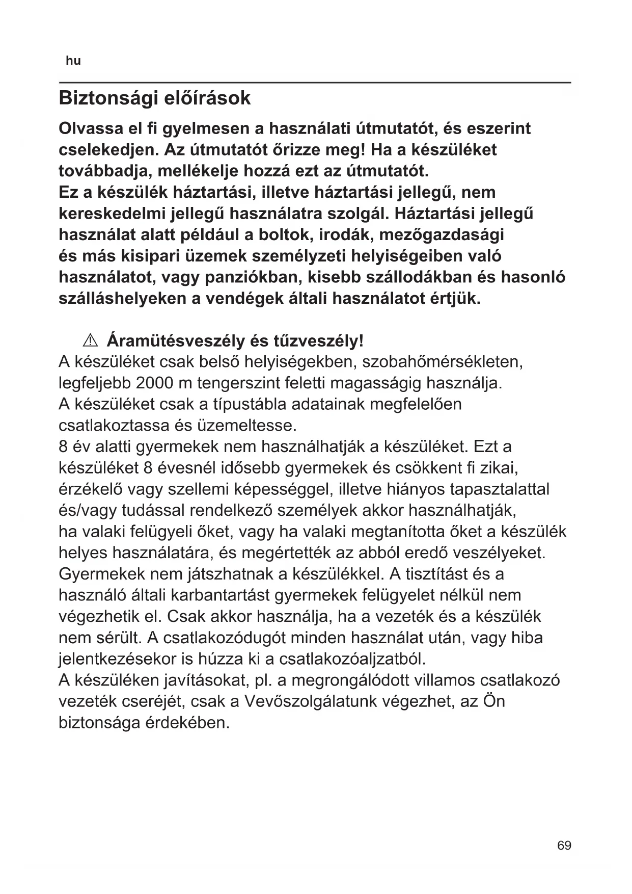 Biztonsági előírások Olvassa el gyelmesen a használati útmutatót, és eszerint cselekedjen. Az útmutatót őrizze meg! Ha a készüléket továbbadja, mellékelje hozzá ezt az útmutatót. Ez a készülék háztartási, illetve háztartási jellegű, nem kereskedelmi jellegű használatra szolgál. Háztartási jellegű használat alatt például a boltok, irodák, mezőgazdasági és más kisipari üzemek személyzeti helyiségeiben való használatot, vagy panziókban, kisebb szállodákban és hasonló szálláshelyeken a vendégek általi használatot értjük. A Áramütésveszély és tűzveszély! A készüléket csak belső helyiségekben, szobahőmérsékleten, legfeljebb 2000 m tengerszint feletti magasságig használja. A készüléket csak a típustábla adatainak megfelelően csatlakoztassa és üzemeltesse. 8 év alatti gyermekek nem használhatják a készüléket. Ezt a készüléket 8 évesnél idősebb gyermekek és csökkent zikai, érzékelő vagy szellemi képességgel, illetve hiányos tapasztalattal és/vagy tudással rendelkező személyek akkor használhatják, ha valaki felügyeli őket, vagy ha valaki megtanította őket a készülék helyes használatára, és megértették az abból eredő veszélyeket. Gyermekek nem játszhatnak a készülékkel. A tisztítást és a használó általi karbantartást gyermekek felügyelet nélkül nem végezhetik el. Csak akkor használja, ha a vezeték és a készülék nem sérült. A csatlakozódugót minden használat után, vagy hiba jelentkezésekor is húzza ki a csatlakozóaljzatból. A készüléken javításokat, pl. a megrongálódott villamos csatlakozó vezeték cseréjét, csak a Vevőszolgálatunk végezhet, az Ön biztonsága érdekében.70