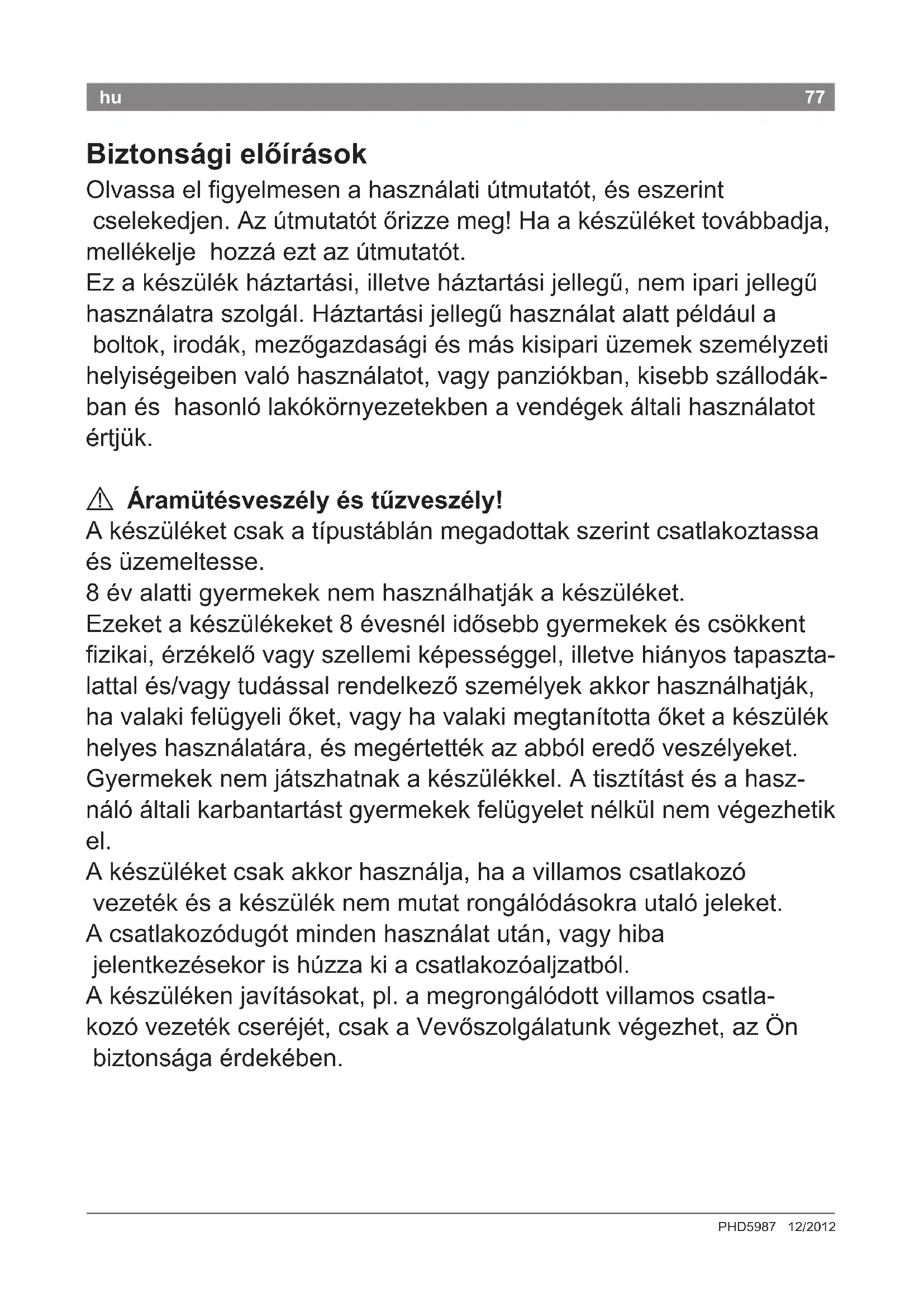 Életveszély! Ne hagyja, hogy a készülék vízzel érintkezzen. Még akkor is élet- veszély áll fenn, ha kikapcsolta a készüléket, ezért használat után, vagy ha megszakítja a használatát, húzza ki a csatlakozódugóját. Nagyobb védelmet jelent, ha a lakás elektromos rendszerébe 30 mA-ig védő hibaáram-védőkapcsolót szereltet be. Kérjen tanácsot villanyszerelőtől.