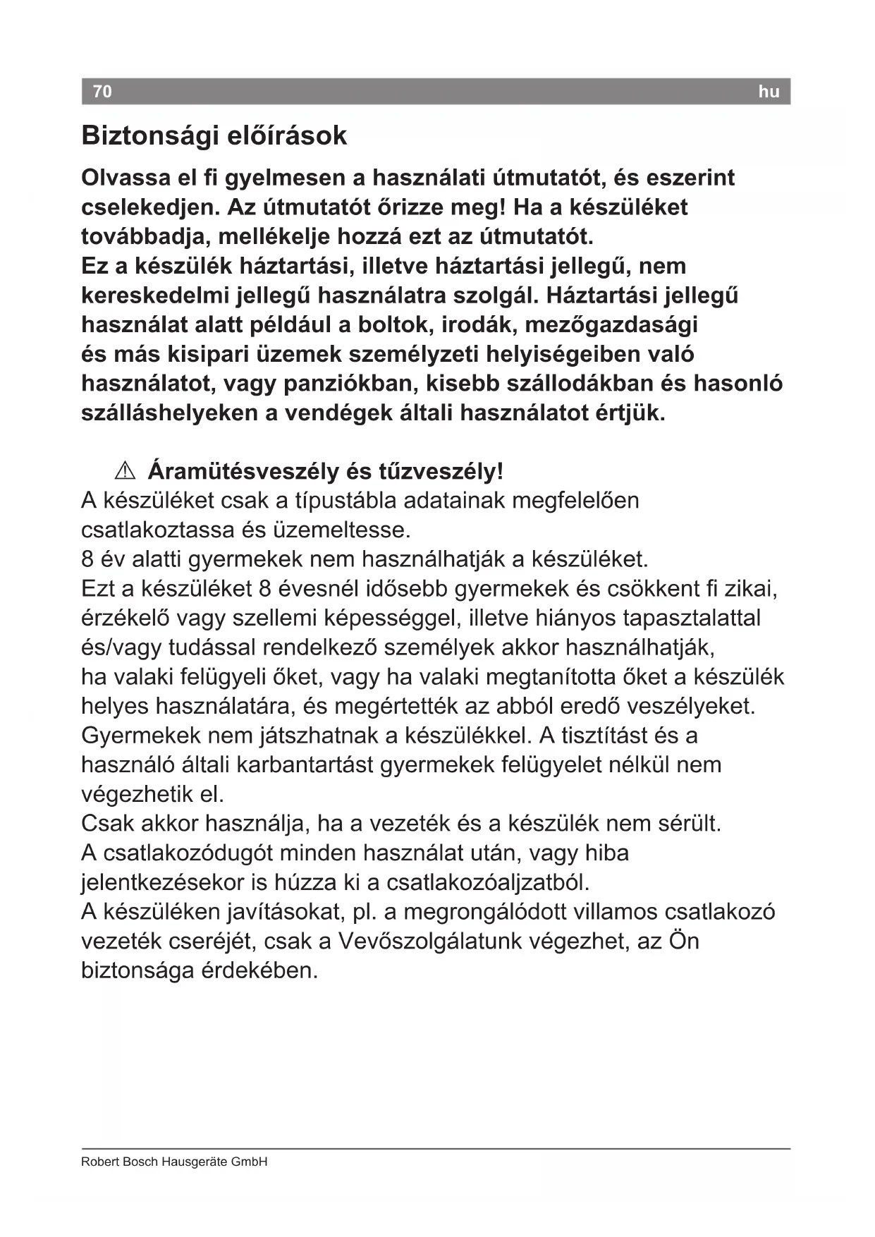 Vízzel teli kád, mosóteknő vagy egyéb edények közelében ne használja a készüléket. A Életveszély! Ne hagyja, hogy a készülék vízzel érintkezzen. Még akkor is életveszély áll fenn, ha kikapcsolta a készüléket, ezért használat után, vagy ha megszakítja a használatát, húzza ki a csatlakozódugóját. Nagyobb védelmet jelent, ha a lakás elektromos rendszerébe 30 mA-ig védő hibaáram-védőkapcsolót szereltet be. Kérjen tanácsot villanyszerelőtől.“ A Fulladásveszély! Ne engedje a gyermekeknek, hogy a csomagolóanyagokkal játszanak. A Megégetés veszélye! A formázófúvóka és a diffúzor felforrósodhat. Mielőtt levenné őket, várjon, amíg kihűlnek.72 Robert Bosch Hausgeräte GmbH