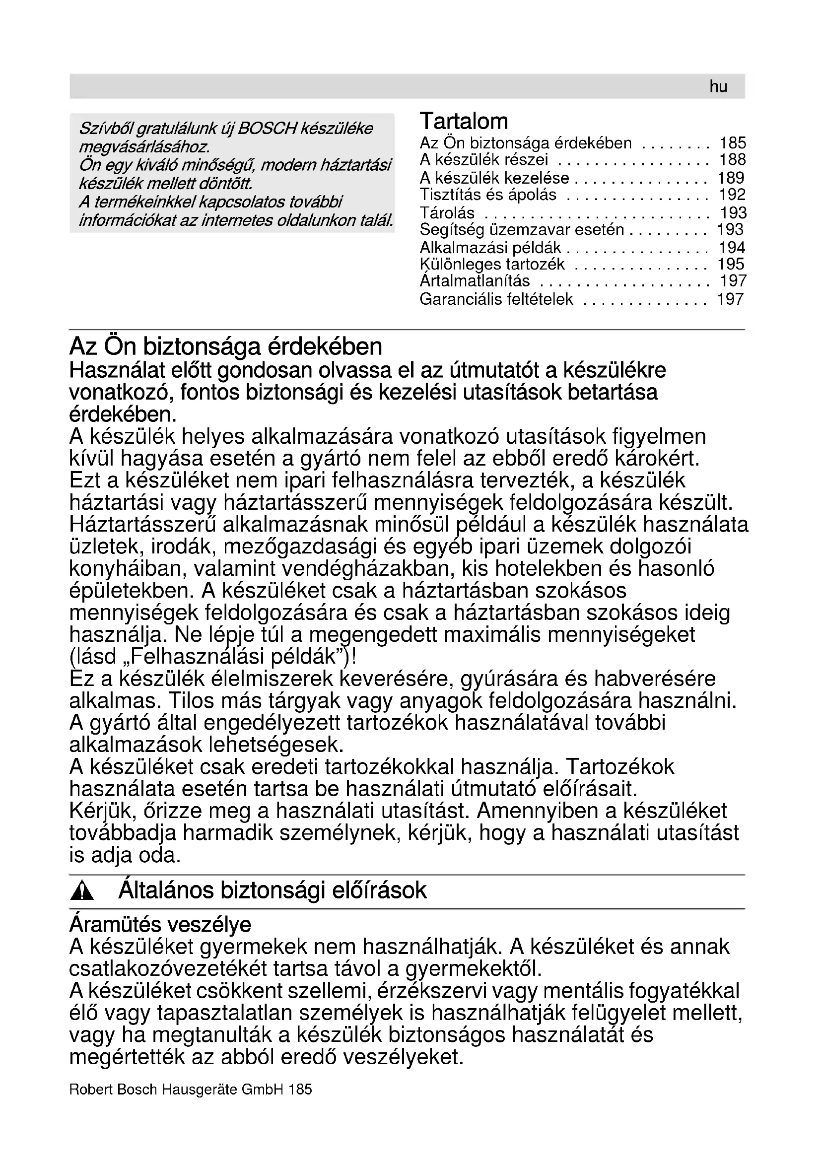 - Garanciális feltételek Az Ön biztonsága érdekében Használat előtt gondosan olvassa el az útmutatót a készülékre vonatkozó, fontos biztonsági és kezelési utasítások betartása érdekében. A készülék helyes alkalmazására vonatkozó utasítások figyelmen kívül hagyása esetén a gyártó nem felel az ebből eredő károkért. Ezt a készüléket nem ipari felhasználásra tervezték, a készülék háztartási vagy háztartásszerű mennyiségek feldolgozására készült. Háztartásszerű alkalmazásnak minősül például a készülék használata üzletek, irodák, mezőgazdasági és egyéb ipari üzemek dolgozói konyháiban, valamint vendégházakban, kis hotelekben és hasonló épületekben. A készüléket csak a háztartásban szokásos mennyiségek feldolgozására és csak a háztartásban szokásos ideig használja. Ne lépje túl a megengedett maximális mennyiségeket (lásd „Felhasználási példák”)! Ez a készülék élelmiszerek keverésére, gyúrására és habverésére alkalmas. Tilos más tárgyak vagy anyagok feldolgozására használni. A gyártó által engedélyezett tartozékok használatával további alkalmazások lehetségesek. A készüléket csak eredeti tartozékokkal használja. Tartozékok használata esetén tartsa be használati útmutató előírásait. Kérjük, őrizze meg a használati utasítást. Amennyiben a készüléket továbbadja harmadik személynek, kérjük, hogy a használati utasítást is adja oda. , Általános biztonsági előírások Áramütés veszélye A készüléket gyermekek nem használhatják. A készüléket és annak csatlakozóvezetékét tartsa távol a gyermekektől. A készüléket csökkent szellemi, érzékszervi vagy mentális fogyatékkal élő vagy tapasztalatlan személyek is használhatják felügyelet mellett, vagy ha megtanulták a készülék biztonságos használatát és megértették az abból eredő veszélyeket. p. 197