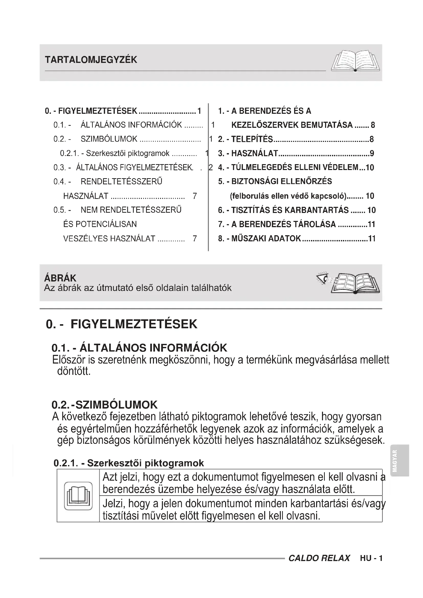 - Aztjelzi,hogyeztadokumentumotgyelmesenelkellolvasnia berendezésüzembehelyezéseés/vagyhasználataelőtt. Jelzi,hogyajelendokumentumotmindenkarbantartásiés/vagy tisztításiműveletelőttgyelmesenelkellolvasni. TARTALOMJEGYZÉK 0. - FIGYELMEZTETÉSEK p. 10