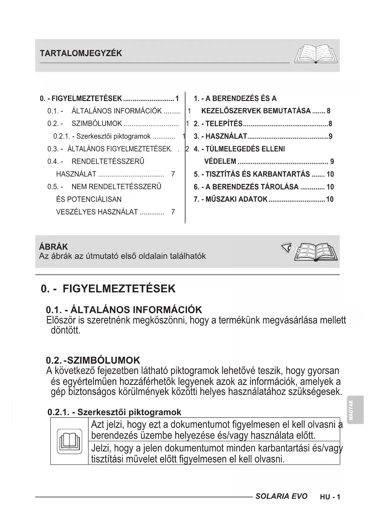 - Aztjelzi,hogyeztadokumentumotgyelmesenelkellolvasnia berendezésüzembehelyezéseés/vagyhasználataelőtt. Jelzi,hogyajelendokumentumotmindenkarbantartásiés/vagy tisztításiműveletelőttgyelmesenelkellolvasni. TARTALOMJEGYZÉK 0. - FIGYELMEZTETÉSEK p. 10