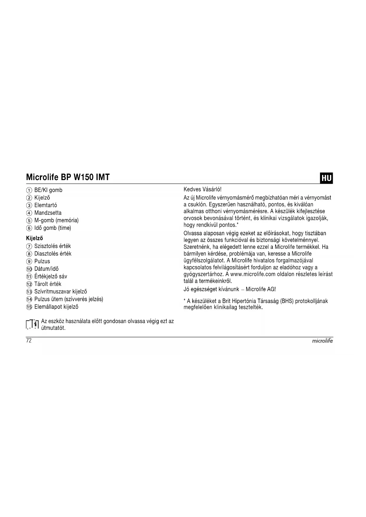 HASZNÁLATI ÚTMUTATÓ BP W150 IMT MICROLIFE