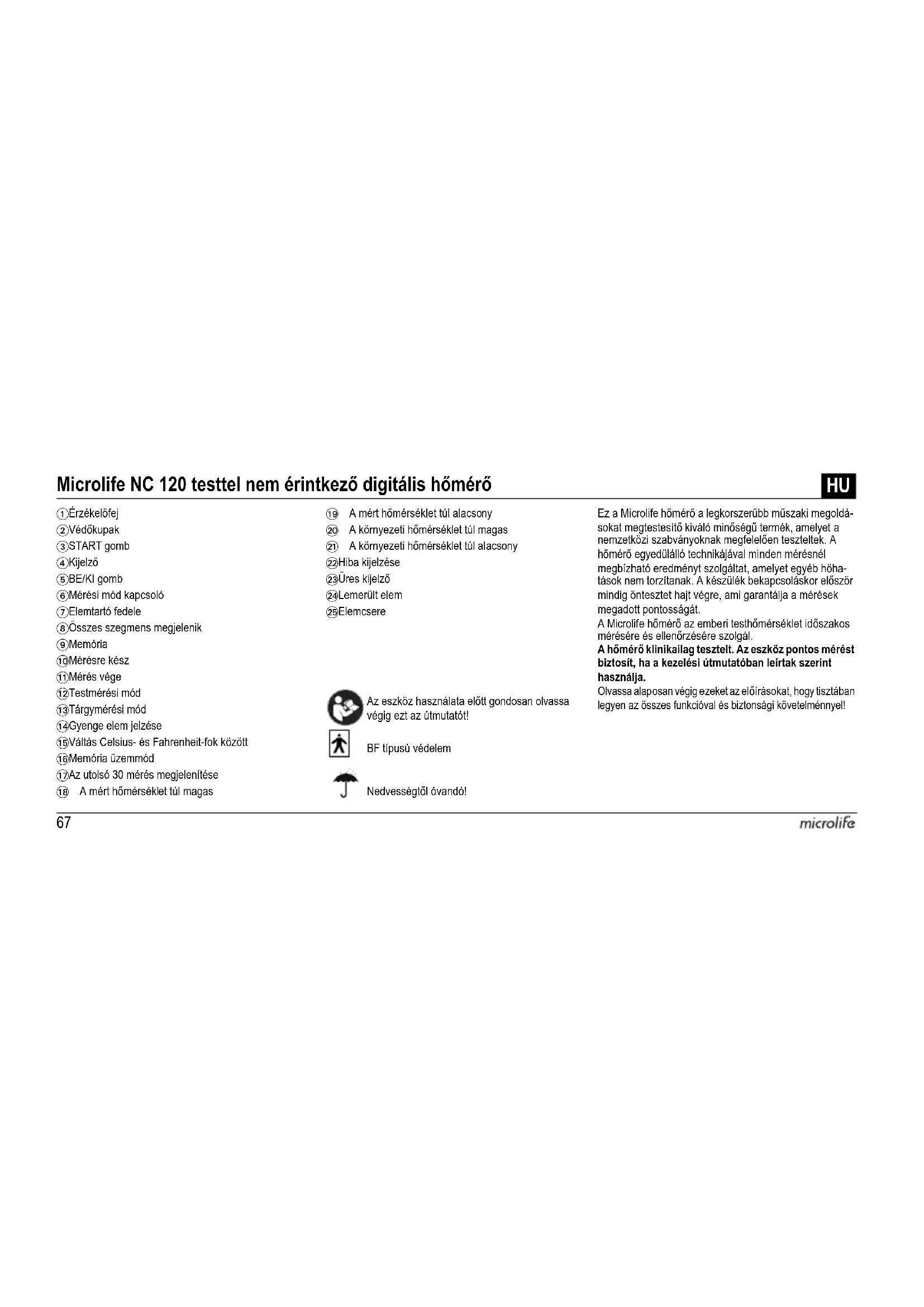 g (bez baterii) Klasa IP: IP21 Normy: ASTM E1965; IEC 60601-1; IEC 60601-1-2 (EMC); IEC 60601-1-11 Przewidywana żywotność urządzenia: 5 lat lub 12000 pomiarów67 Az eszköz használata előtt gondosan olvassa végig ezt az útmutatót! BF típusú védelem Ez a Microlife hőmérő a legkorszerűbb műszaki megoldá- sokat megtestesítő kiváló minőségű termék, amelyet a nemzetközi szabványoknak megfelelően teszteltek. A hőmérő egyedülálló technikájával minden mérésnél megbízható eredményt szolgáltat, amelyet egyéb hőha- tások nem torzítanak. A készülék bekapcsoláskor először mindig öntesztet hajt végre, ami garantálja a mérések megadott pontosságát. A Microlife hőmérő az emberi testhőmérséklet időszakos mérésére és ellenőrzésére szolgál. A hőmérő klinikailag tesztelt. Az eszköz pontos mérést biztosít, ha a kezelési útmutatóban leírtak szerint használja. Olvassa alaposan végig ezeket az előírásokat, hogy tisztában legyen az összes funkcióval és biztonsági követelménnyel! Microlife NC 120 testtel nem érintkező digitális hőmérő