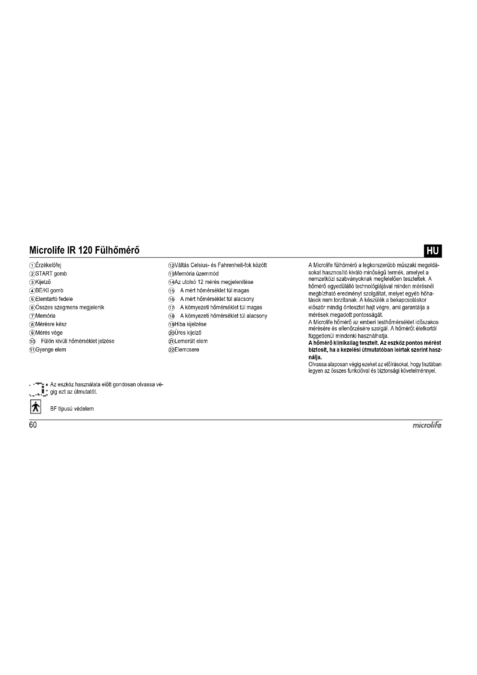 Az eszköz használata előtt gondosan olvassa vé- gig ezt az útmutatót. BF típusú védelem A Microlife fülhőmérő a legkorszerűbb műszaki megoldá- sokat hasznosító kiváló minőségű termék, amelyet a nemzetközi szabványoknak megfelelően teszteltek. A hőmérő egyedülálló technológiájával minden mérésnél megbízható eredményt szolgáltat, melyet egyéb hőha- tások nem torzítanak. A készülék a bekapcsoláskor először mindig öntesztet hajt végre, ami garantálja a mérések megadott pontosságát. A Microlife hőmérő az emberi testhőmérséklet időszakos mérésére és ellenőrzésére szolgál. A hőmérőt életkortól függetlenül mindenki használhatja. A hőmérő klinikailag tesztelt. Az eszköz pontos mérést biztosít, ha a kezelési útmutatóban leírtak szerint hasz- nálja. Olvassa alaposan végig ezeket az előírásokat, hogy tisztában legyen az összes funkcióval és biztonsági követelménnyel. Microlife IR 120 Fülhőmérő