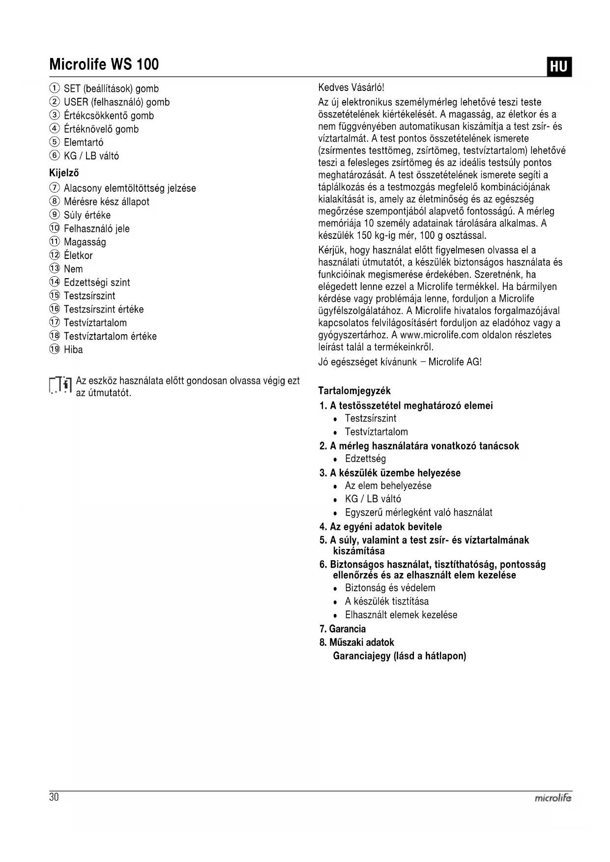 Precyzja i powtarzalność wyników z dokładnością do: +/- 0,1kg / 0,2lb / 1/4st30 Kijelző Kedves Vásárló! Az új elektronikus személymérleg lehetővé teszi teste összetételének kiértékelését. A magasság, az életkor és a nem függvényében automatikusan kiszámítja a test zsír- és víztartalmát. A test pontos összetételének ismerete (zsírmentes testtömeg, zsírtömeg, testvíztartalom) lehetővé teszi a felesleges zsírtömeg és az ideális testsúly pontos meghatározását. A test összetételének ismerete segíti a táplálkozás és a testmozgás megfelelő kombinációjának kialakítását is, amely az életminőség és az egészség megőrzése szempontjából alapvető fontosságú. A mérleg memóriája 10 személy adatainak tárolására alkalmas. A készülék 150 kg-ig mér, 100 g osztással. Kérjük, hogy használat előtt figyelmesen olvassa el a használati útmutatót, a készülék biztonságos használata és funkcióinak megismerése érdekében. Szeretnénk, ha elégedett lenne ezzel a Microlife termékkel. Ha bármilyen kérdése vagy problémája lenne, forduljon a Microlife ügyfélszolgálatához. A Microlife hivatalos forgalmazójával kapcsolatos felvilágosításért forduljon az eladóhoz vagy a gyógyszertárhoz. A www.microlife.com oldalon részletes leírást talál a termékeinkről. Jó egészséget kívánunk