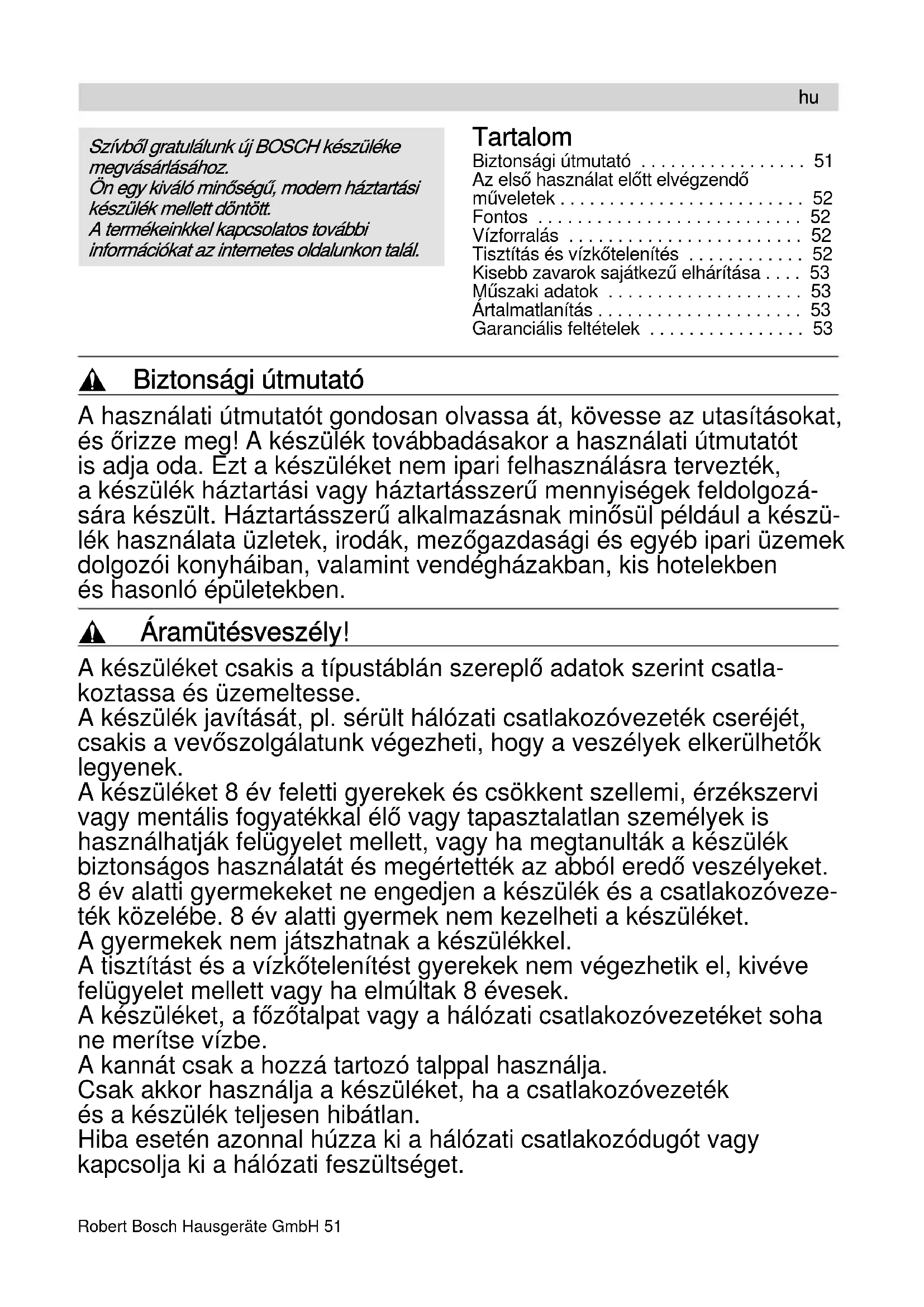 - Garanciális feltételek , Biztonsági útmutató A használati útmutatót gondosan olvassa át, kövesse az utasításokat, és őrizze meg! A készülék továbbadásakor a használati útmutatót is adja oda. Ezt a készüléket nem ipari felhasználásra tervezték, a készülék háztartási vagy háztartásszerű mennyiségek feldolgozá- sára készült. Háztartásszerű alkalmazásnak minősül például a készü- lék használata üzletek, irodák, mezőgazdasági és egyéb ipari üzemek dolgozói konyháiban, valamint vendégházakban, kis hotelekben és hasonló épületekben. , Áramütésveszély! A készüléket csakis a típustáblán szereplő adatok szerint csatla- koztassa és üzemeltesse. A készülék javítását, pl. sérült hálózati csatlakozóvezeték cseréjét, csakis a vevőszolgálatunk végezheti, hogy a veszélyek elkerülhetők legyenek. A készüléket 8 év feletti gyerekek és csökkent szellemi, érzékszervi vagy mentális fogyatékkal élő vagy tapasztalatlan személyek is használhatják felügyelet mellett, vagy ha megtanulták a készülék biztonságos használatát és megértették az abból eredő veszélyeket. 8 év alatti gyermekeket ne engedjen a készülék és a csatlakozóveze- ték közelébe. 8 év alatti gyermek nem kezelheti a készüléket. A gyermekek nem játszhatnak a készülékkel. A tisztítást és a vízkőtelenítést gyerekek nem végezhetik el, kivéve felügyelet mellett vagy ha elmúltak 8 évesek. A készüléket, a főzőtalpat vagy a hálózati csatlakozóvezetéket soha ne merítse vízbe. A kannát csak a hozzá tartozó talppal használja. Csak akkor használja a készüléket, ha a csatlakozóvezeték és a készülék teljesen hibátlan. Hiba esetén azonnal húzza ki a hálózati csatlakozódugót vagy kapcsolja ki a hálózati feszültséget. p. 53