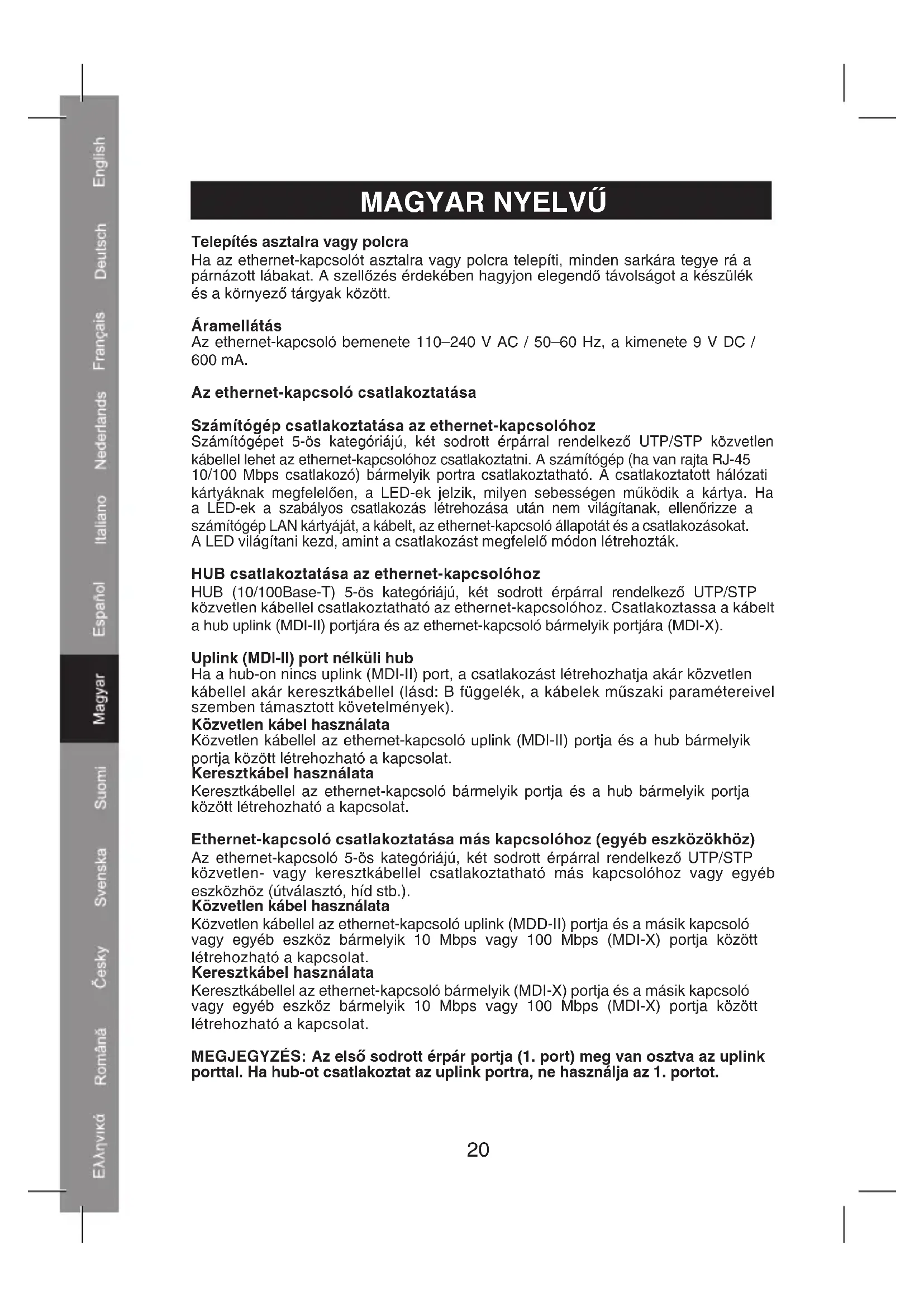 ELETTRICHE NON APRIRE ATTENZIONE Per ridurre il rischio di scosse elettriche, questo prodotto deve essere aperto ESCLUSIVAMENTE da personale tecnico specializzato, se occorre assistenza. Se si dovessero verificare dei problemi, scollegare il prodotto dall'alimentazione di rete e da ogni altra apparecchiatura. Non esporre il prodotto ad acqua o umidità. Manutenzione: Pulire solo con un panno asciutto. Non utilizzare solventi detergenti o abrasivi. Garanzia: Non sarà accettata alcuna garanzia o responsabilità in relazione a cambiamenti e modifiche del prodotto o a danni determinati dall'uso non corretto del prodotto stesso. Generalità: Il design e le caratteristiche tecniche sono soggetti a modifica senza necessità di preavviso. Tutti i marchi a logo e i nomi di prodotto sono marchi commerciali o registrati dei rispettivi titolari e sono in questo documento riconosciuti come tali. Conservare il presente manuale da consultare in occasioni future. Attenzione: Il prodotto è contrassegnato con questo simbolo, con il quale si indica che i prodotti elettrici ed elettronici usati non devono essere gettati insieme ai rifiuti domestici. Per questi prodotti esiste un sistema di raccolta differenziata. Copyright ©17 ESPAÑOL Instalación en escritorio o estantería Cuando instale el conmutador en un escritorio o estantería, una estos pies de protección en la parte inferior de cada esquina del dispositivo. Deje un espacio suficiente entre el dispositivo y los objetos que lo rodean. Alimentación: El conmutador puede utilizarse con la entrada de 110-240VAC/50-60Hz y la salida de DC9V/600mA. Conexión del conmutador PC al conmutador Podrá conectar un PC al conmutador mediante un cable recto bipar de categoría 5 UTP/STP. El PC (equipado con una toma RJ-45 10/100Mbps) puede conectarse a cualquiera de los puertos. En función de las tarjetas de red conectadas, las LED indican la velocidad a la que operan las tarjetas. Si los indicadores de la LED no se encienden tras realizar una conexión adecuada, compruebe la tarjeta LAN del PC, el cable, las condiciones del conmutador y las conexiones. El indicador LED se enciende una vez que haya realizado la conexión adecuada. Central al conmutador Podrá conectar una central (10/100 Base-T) al conmutador mediante un cable recto bipar de categoría 5 UTP/STP. Conecte el cable al puerto de enlace de la central (MDI-II) con cualquiera de los puertos del conmutador (MDI-X). Central sin el puerto de enlace (MDI-II) Si la central no está equipada con un puerto de enlace (MDI-II), realizará una conexión utilizando un cable recto o un cable cruzado (véase el Anexo B, Especificaciones técnicas para los requisitos del cable). Uso del cable recto Cuando utilice un cable recto, la conexión podrá realizarse a partir del puerto de enlace (MDI-II) del conmutador a cualquier puerto de la central. Uso del cable cruzado Cuando utilice un cable cruzado, la conexión podrá realizarse a partir del puerto del conmutador a cualquier puerto de la central. Conmutador a conmutador (otros dispositivos) El conmutador puede conectarse a otro interruptor o dispositivo (enrutador, puente, etc.) mediante un cable cruzado o recto bipar de categoría 5UTP/STP. Uso del cable recto Cuando utilice un cable recto, la conexión se realizará a partir del puerto de enlace (MDD-II) del conmutador a cualquier puerto de 10Mbps o 100Mbps (MDI-X) de otro conmutador o dispositivo. Uso del cable cruzado Cuando utilice un cable cruzado, la conexión se realizará a partir de cualquier puerto (MDI-X) del conmutador a cualquier puerto de 10Mbps o 100Mbps (MDI-X) de otro conmutador o dispositivo. Nota: El primer puerto de par girado (puerto 1x) se comparte con el puerto de enlace. Si conecta una central al puerto de enlace, no utilice el puerto 1x.18 Declaración de conformidad La empresa infraescrita, Nedis B.V. De Tweeling 28 5215MC ’s-Hertogenbosch Países Bajos Tel.: 0031 73 599 1055 Email: info@nedis.com Declara que el producto: Marca: König Electronic Modelo: CMP-EHUB15 Descripción: Conmutador ethernet de 5 puertos se encuentra conforme a las siguientes normas: EN55022: 1998+A1: 2000+A2: 2003 EN61000-3-2: 2000 EN61000-3-3: 1995+A1: 2001 EN55024: 1998+A1: 2001+A2: 2003 Y cumple con todos los requisitos de las directivas de la Unión Europea 89/336/EC ‘s-Hertogenbosch, 31-03-09 D. J. Gilad Director de compras19 Medidas de seguridad: RIESGO DE ELECTROCUCIÓN NO ABRIR ATENCIÓN Para reducir los riesgos de electrocución, este producto deberá ser abierto EXCLUSIVAMENTE por un técnico habilitado cuando necesite ser reparado. Desconecte el producto de la red y de cualquier otro equipo si se registra algún problema. No exponga el producto al agua ni a la humedad. Mantenimiento: Limpiar exclusivamente con un paño seco. No utilice disolventes ni productos de limpieza agresivos. Garantía: No se aceptará ninguna garantía o responsabilidad derivada de cualquier cambio o modificaciones realizadas al producto o daños provocados por un uso incorrecto del presente producto. General: Las ilustraciones y las especificaciones podrán sufrir cambios sin previo aviso. Todas las marcas de los logotipos y los nombres de productos constituyen patentes o marcas registradas de sus titulares correspondientes, reconocidos como tal. Conserve este manual para acudir a él posteriormente. Cuidado: Este producto está señalizado con este símbolo. Esto significa que los productos eléctricos y electrónicos gastados no deberán mezclarse con los desechos domésticos generales. Existen distintos sistemas de recogida individuales para este tipo de productos. Copyright ©20 MAGYAR NYELVŰ Telepítés asztalra vagy polcra Ha az ethernet-kapcsolót asztalra vagy polcra telepíti, minden sarkára tegye rá a párnázott lábakat. A szellőzés érdekében hagyjon elegendő távolságot a készülék és a környező tárgyak között. Áramellátás Az ethernet-kapcsoló bemenete 110–240 V AC / 50–60 Hz, a kim