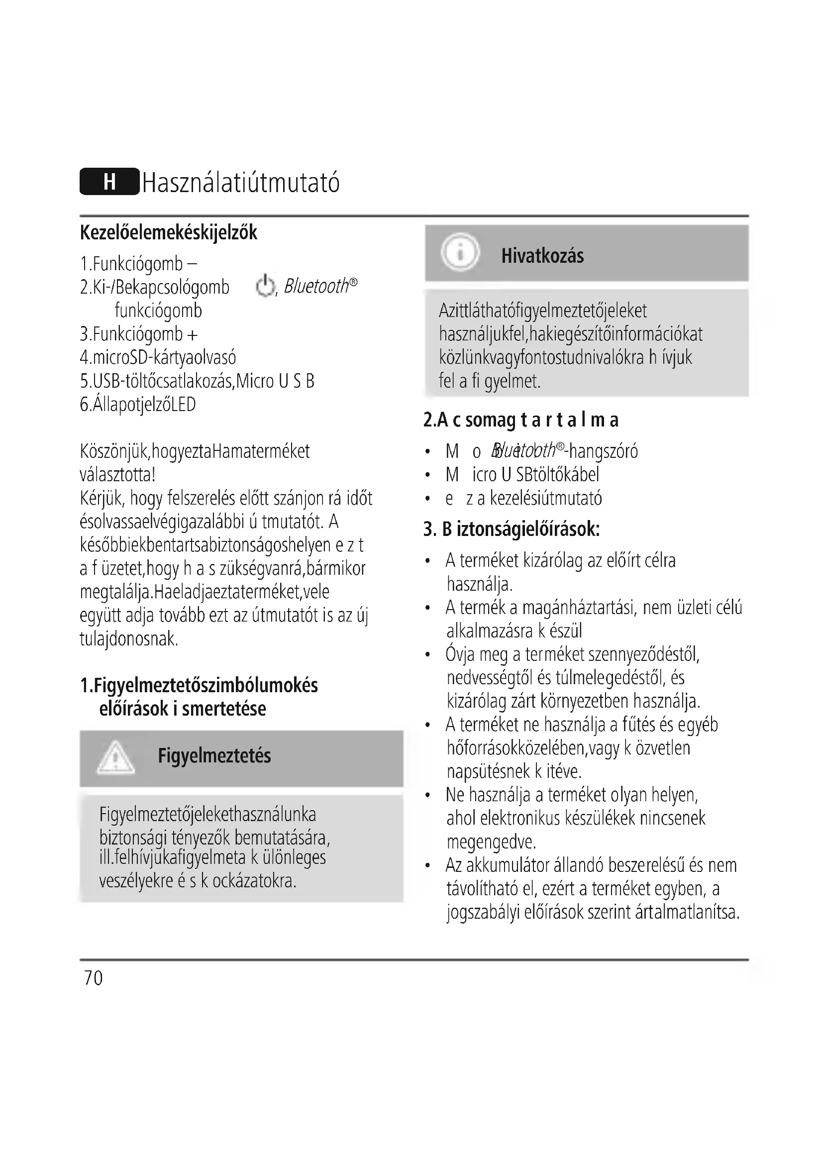 - Azakkumulátor állandóbeszerelésű és nem távolíthatóel, ezért aterméket egyben, a jogszabályi előírások szerintártalmatlanítsa. H Használati útmutató71