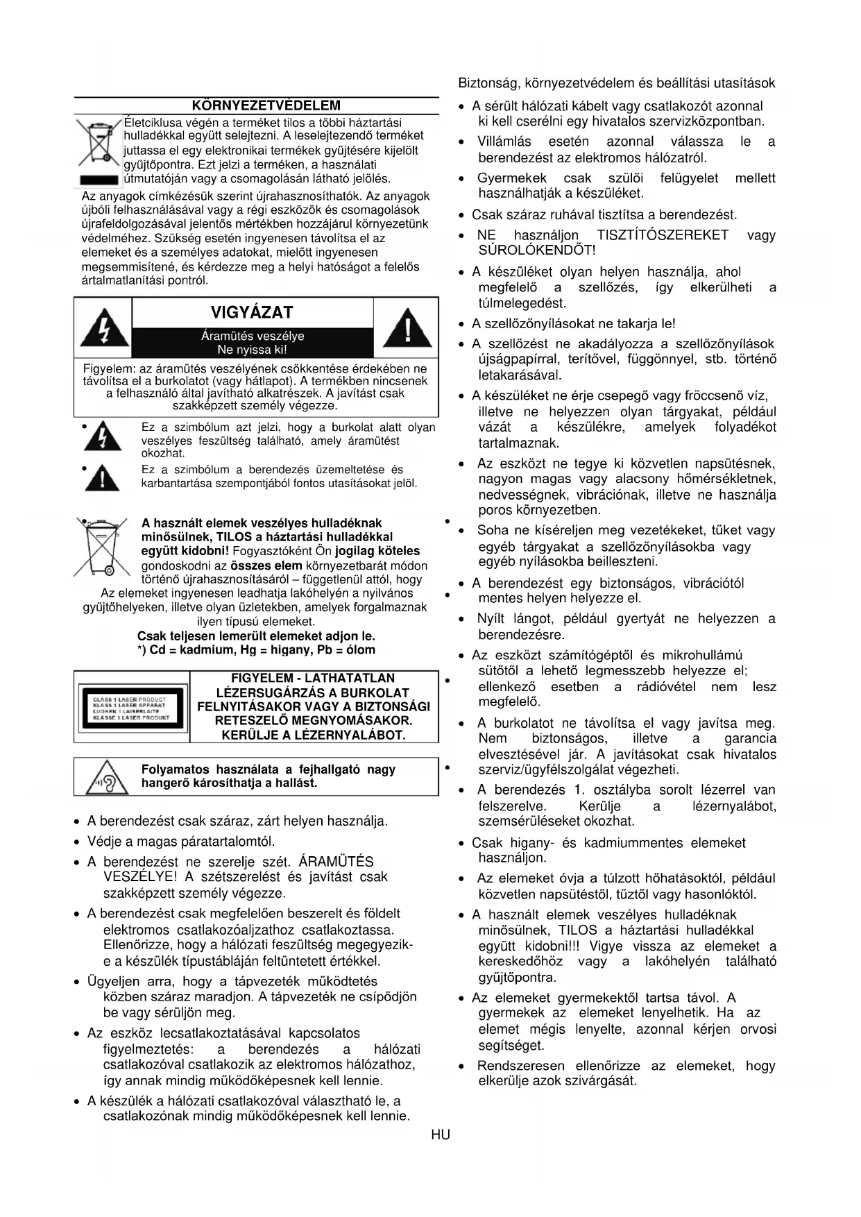 Az elemeket ingyenesen leadhatja lakóhelyén a nyilvános gyűjtőhelyeken, illetve olyan üzletekben, amelyek forgalmaznak ilyen típusú elemeket. Csak teljesen lemerült elemeket adjon le. *) Cd = kadmium, Hg = higany, Pb = ólom