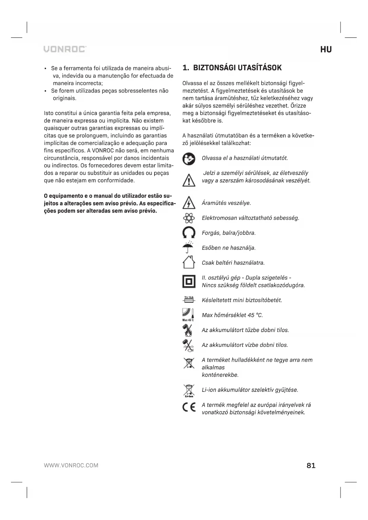MULÁTORHOZ a) Ne bontsa szét az akkumulátort. Az veszélyes rövidzárlatot okozhat. b) Hőbehatástól védje az akkumulátort, pl. ne te- gye ki folyamatos erős napsugárzásnak, tűztől, víztől és más nedvességtől is védje. Robbanás- veszély. c) Ha az akkumulátor sérült, vagy rendellenesen használják, gőzök áramolhatnak belőle. Szel- lőztesse át amunkaterületet, és ha egészségi panaszai vannak, kérjen orvosi segítséget. Agőzök irritálhatják alégutakat. d) Az akkumulátort csak aVonroc termékéhez használja. Ezzel az intézkedéssel veszélyes túlterheléstől védi az akkumulátorát. e) Az akkumulátor megsérülhet, ha akülsejét he- gyes tárggyal (pl. szeggel, csavarhúzóval) vagy erőszakosan manipulálják. Belső rövidzárlat következhet be, amitől az akkumulátor leéghet, füstölhet, robbanhat vagy túlmelegedhet. ATÖLTŐRE VONATKOZÓ BIZTONSÁGI FIGYEL MEZTETÉSEK Rendeltetése Atöltővel kizárólag CD801AA és CD803AA típusú újratölthető akkumulátorcsomagokat töltsön fel. Másfajta akkumulátorok használata személyi sérülést és károkat okozhat. a) Avillamos készüléket csökkent fizikai, érzék- szervi vagy szellemi képességű személyek (gyermekeket is ideértve) vagy tapasztalat, ismeret híján csak felügyelet vagy útmutatás mellett használhatják. b) Figyelni kell, nehogy agyerekek játszanak akészülékkel. c) Nem újratölthető elemek újratöltésével próbál- kozni tilos! d) Az akkumulátorok töltését jól szellőző helyen kell végezni!HU