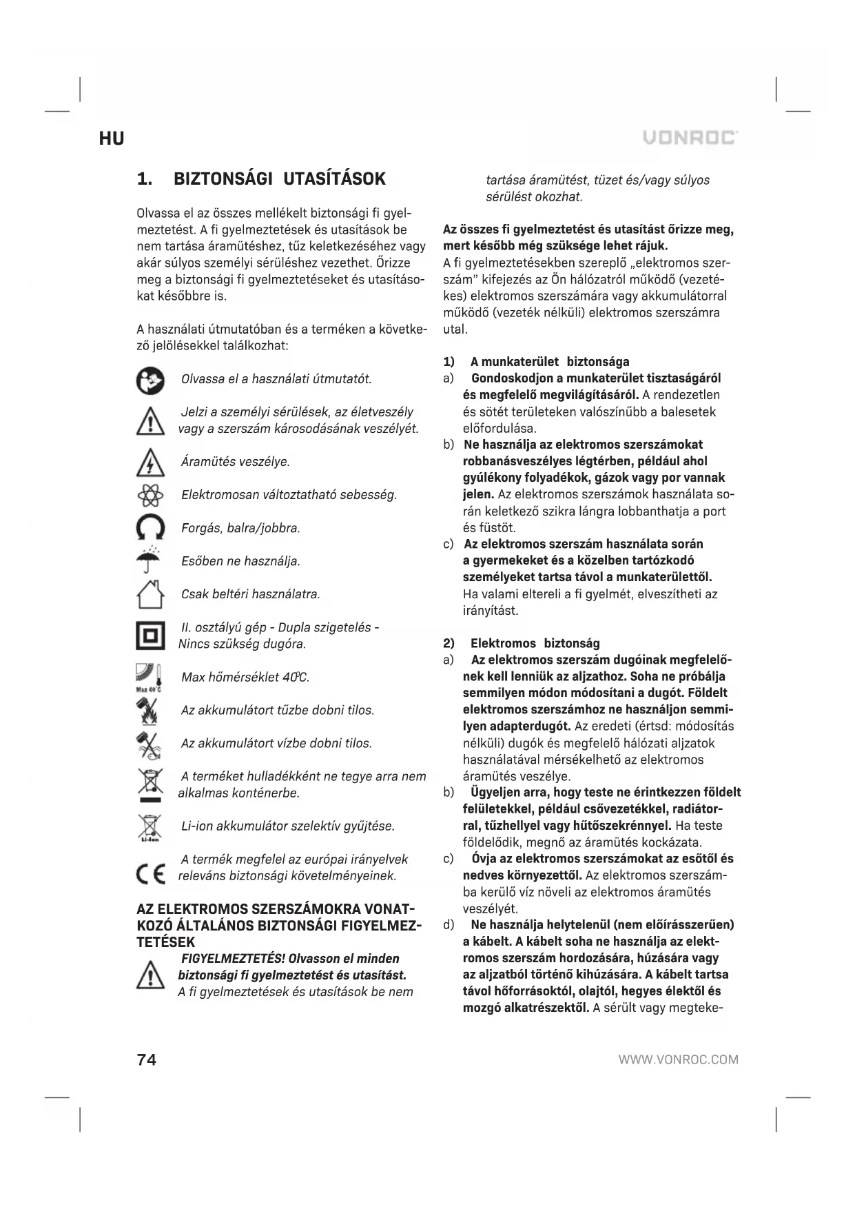 MULÁTORHOZ a) Ne bontsa szét az akkumulátort. Az veszélyes rövidzárlatot okozhat. b) Hőbehatástól védje az akkumulátort, pl. ne te- gye ki folyamatos erős napsugárzásnak, tűztől, víztől és más nedvességtől is védje. Robbanás- veszély. c) Ha az akkumulátor sérült, vagy rendellenesen használják, gőzök áramolhatnak belőle. Szel- lőztesse át amunkaterületet, és ha egészségi panaszai vannak, kérjen orvosi segítséget. Agőzök irritálhatják alégutakat. d) Az akkumulátort csak aVonroc termékéhez használja. Ezzel az intézkedéssel veszélyes túlterheléstől védi az akkumulátorát. e) Az akkumulátor megsérülhet, ha akülsejét he- gyes tárggyal (pl. szeggel, csavarhúzóval) vagy erőszakosan manipulálják. Belső rövidzárlat következhet be, amitől az akkumulátor leéghet, füstölhet, robbanhat vagy túlmelegedhet.