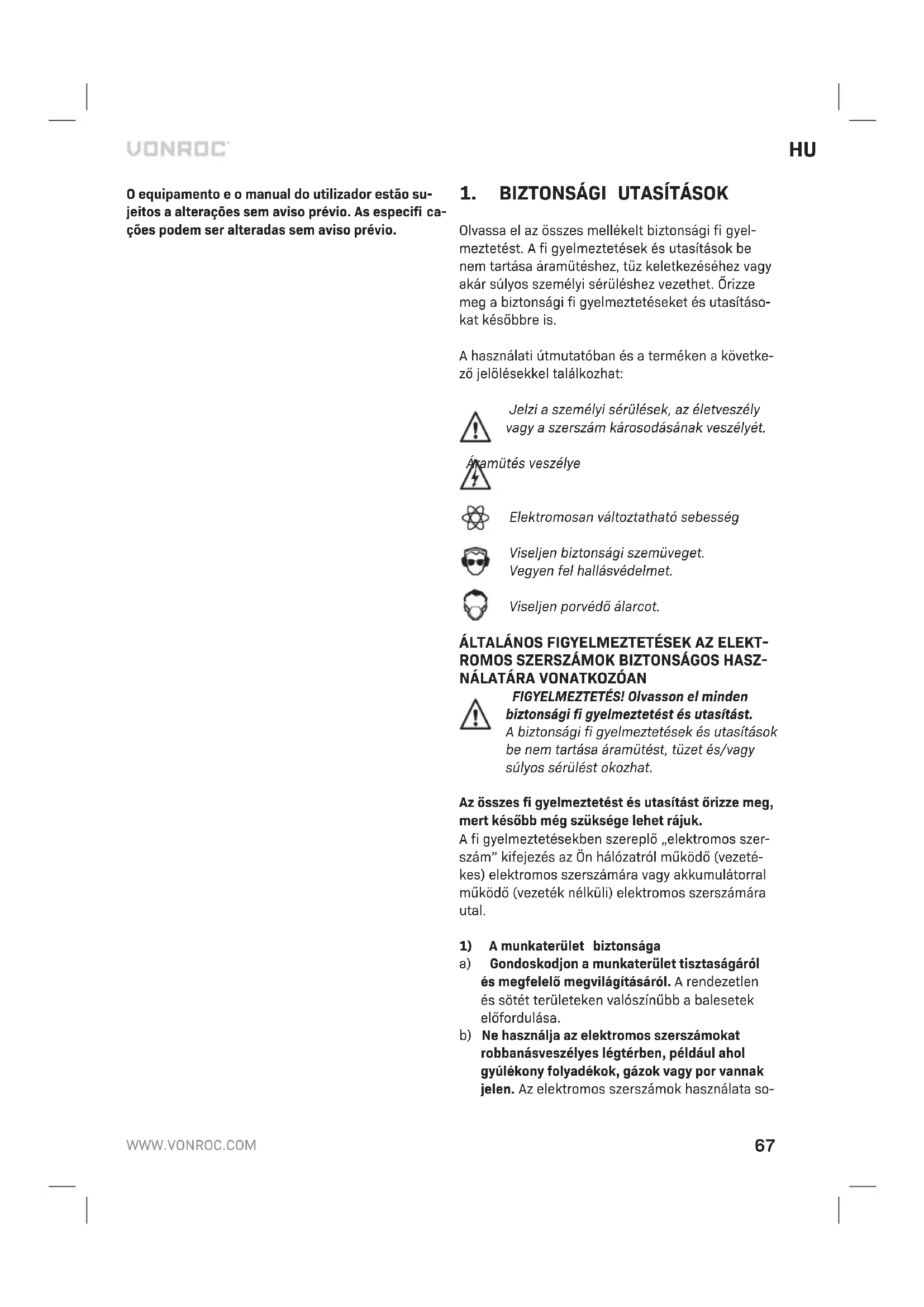 a) Gondoskodjon amunkaterület tisztaságáról és megfelelő megvilágításáról. Arendezetlen és sötét területeken valószínűbb abalesetek előfordulása. b) Ne használja az elektromos szerszámokat robbanásveszélyes légtérben, például ahol gyúlékony folyadékok, gázok vagy por vannak jelen. Az elektromos szerszámok használata so-68