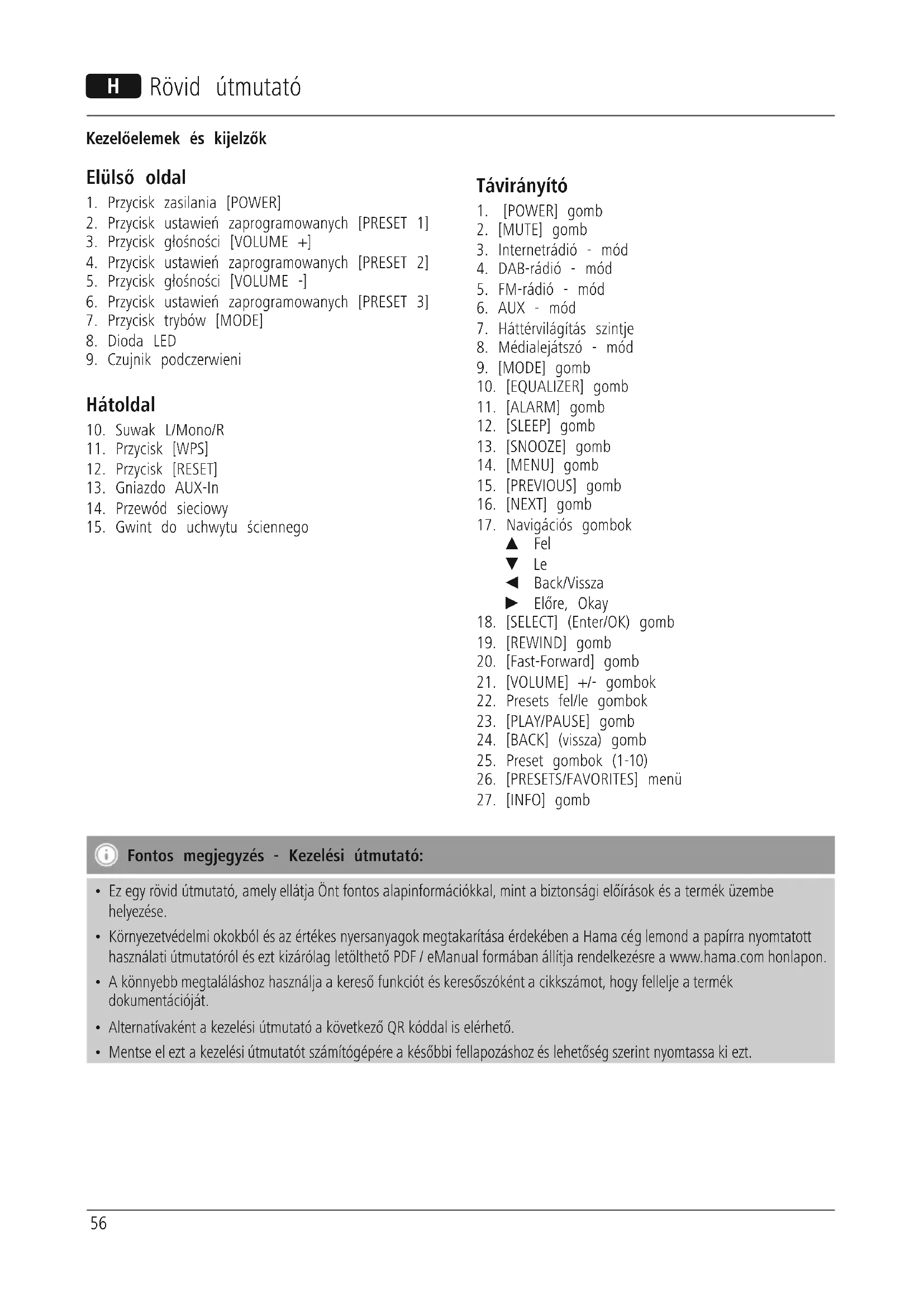 - Környezetvédelmi okokból és az értékes nyersanyagok megtakarítása érdekében a Hama cég lemond a papírra nyomtatott használati útmutatóról és ezt kizárólag letölthető PDF / eManual formában állítja rendelkezésre a www.hama.com honlapon.