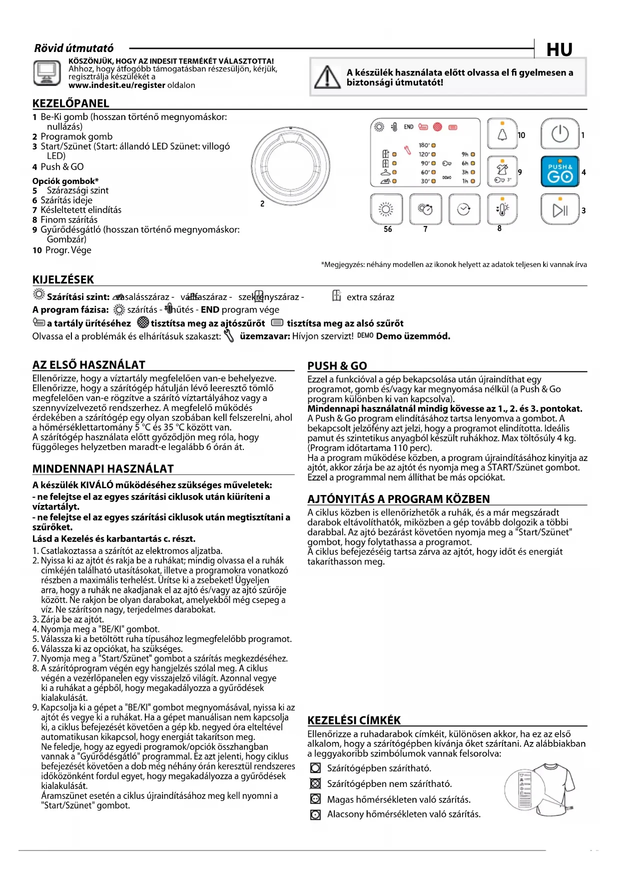 ajtót és vegye ki a ruhákat. Ha a gépet manuálisan nem kapcsolja ki, a ciklus befejezését követően a gép kb. negyed óra elteltével automatikusan kikapcsol, hogy energiát takarítson meg. Ne feledje, hogy az egyedi programok/opciók összhangban vannak a "Gyűrődésgátló" programmal. Ez azt jelenti, hogy ciklus befejezését követően a dob még néhány órán keresztül rendszeres időközönként fordul egyet, hogy megakadályozza a gyűrődések kialakulását. Áramszünet esetén a ciklus újraindításához meg kell nyomni a "Start/Szünet" gombot. PUSH & GO Ezzel a funkcióval a gép bekapcsolása után újraindíthat egy programot, gomb és/vagy kar megnyomása nélkül (a Push & Go program különben ki van kapcsolva). Mindennapi használatnál mindig kövesse az 1., 2. és 3. pontokat. A Push & Go program elindításához tartsa lenyomva a gombot. A bekapcsolt jelzőfény azt jelzi, hogy a programot elindította. Ideális pamut és szintetikus anyagból készült ruhákhoz. Max töltősúly 4 kg. (Program időtartama 110 perc). Ha a program működése közben, a program újraindításához kinyitja az ajtót, akkor zárja be az ajtót és nyomja meg a START/Szünet gombot. Ezzel a programmal nem állíthat be más opciókat. AJTÓNYITÁS A PROGRAM KÖZBEN A ciklus közben is ellenőrizhetők a ruhák, és a már megszáradt darabok eltávolíthatók, miközben a gép tovább dolgozik a többi darabbal. Az ajtó bezárást követően nyomja meg a "Start/Szünet" gombot, hogy folytathassa a programot. A ciklus befejezéséig tartsa zárva az ajtót, hogy időt és energiát takaríthasson meg. Indesit_Tilt_Mono_Dryer_M10 start delay