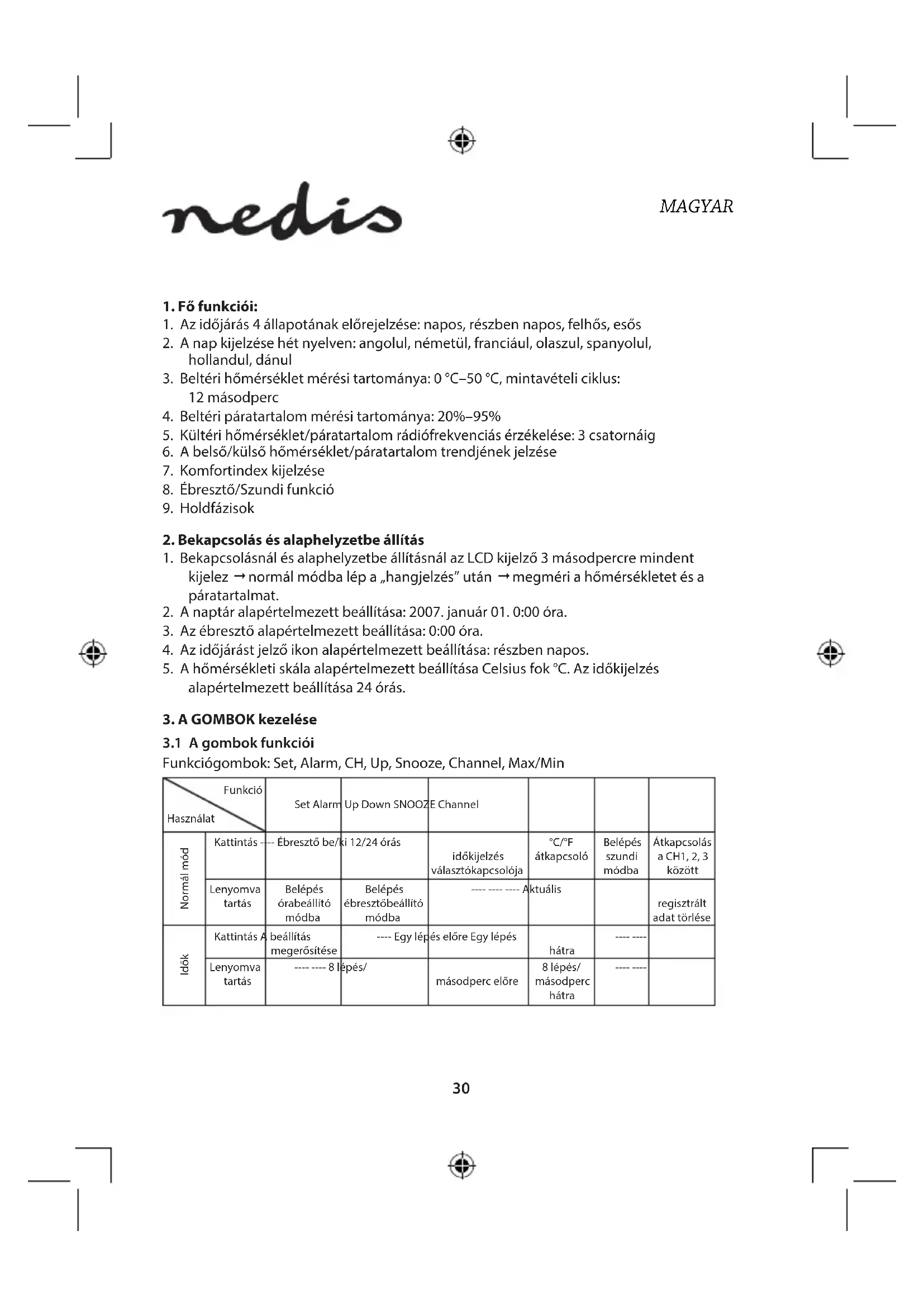 Funkciógombok: Set, Alarm, CH, Up, Snooze, Channel, Max/Min Funkció Használat Set Alarm Up Down SNOOZE Channel Normál mód Kattintás ---- Ébresztő be/ki 12/24órás időkijelzés választókapcsolója °C/°F átkapcsoló Belépés szundi módba Átkapcsolás a CH1, 2, 3 között Lenyomva tartás Belépés órabeállító módba Belépés ébresztőbeállító módba ---- ---- ---- Aktuális regisztrált adat törlése Idők Kattintás A beállítás megerősítése ---- Egy lépés előre Egy lépés hátra