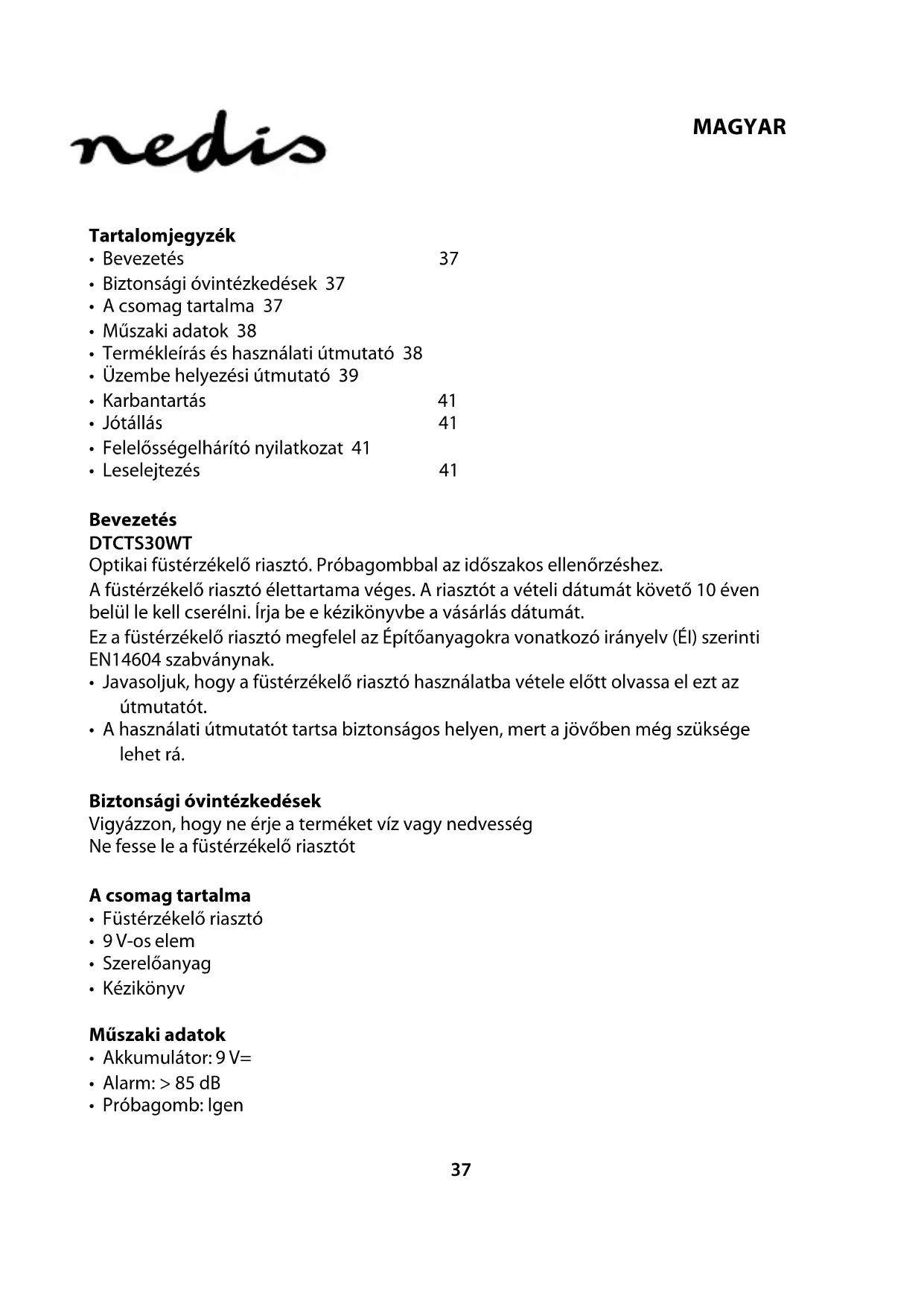 Töltse le az útmutatót a következőhöz Füstérzékelő PDF formátumban ingyenesen! Találja meg kézikönyvét DTCTS30WT - NEDIS és vegye vissza elektronikus eszközét a kezébe. Ezen az oldalon közzé van téve az eszköze használatához szükséges összes dokumentum. DTCTS30WT márka NEDIS.