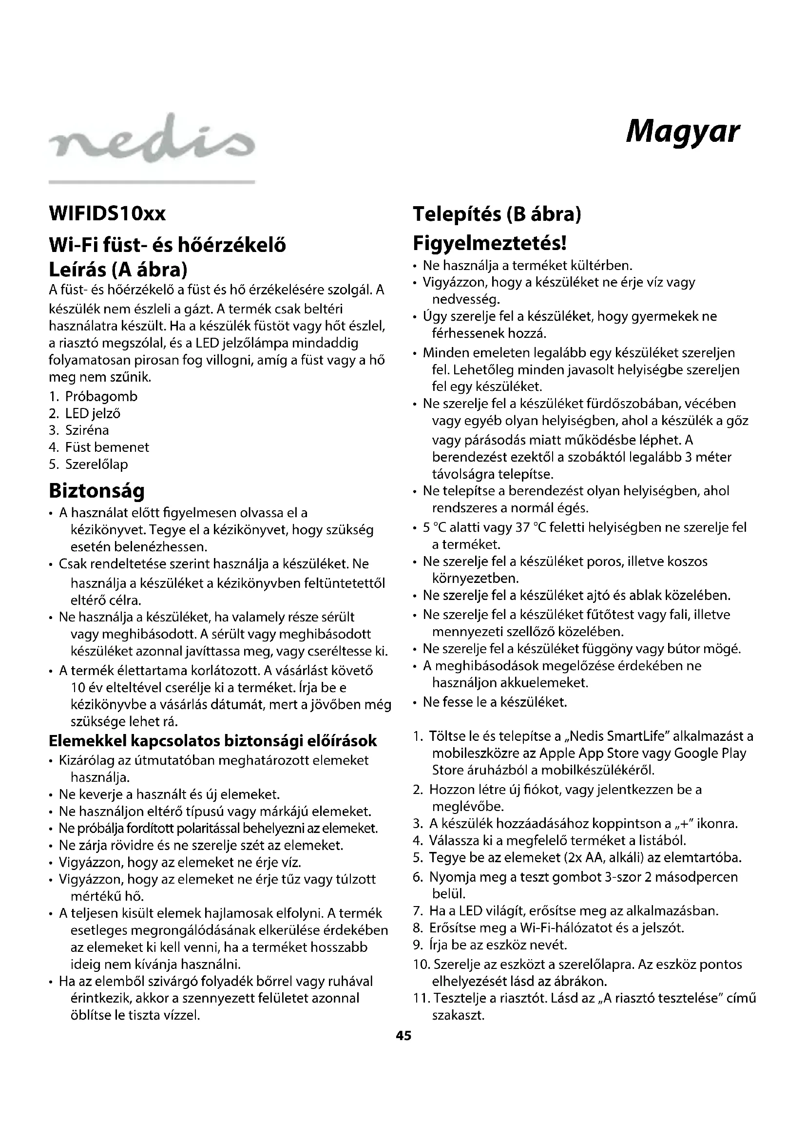 WIFIDS10xx Wi-Fi füst- és hőérzékelő Leírás (A ábra) A füst- és hőérzékelő a füst és hő érzékelésére szolgál. A készülék nem észleli a gázt. A termék csak beltéri használatra készült. Ha a készülék füstöt vagy hőt észlel, a riasztó megszólal, és a LED jelzőlámpa mindaddig folyamatosan pirosan fog villogni, amíg a füst vagy a hő meg nem szűnik.