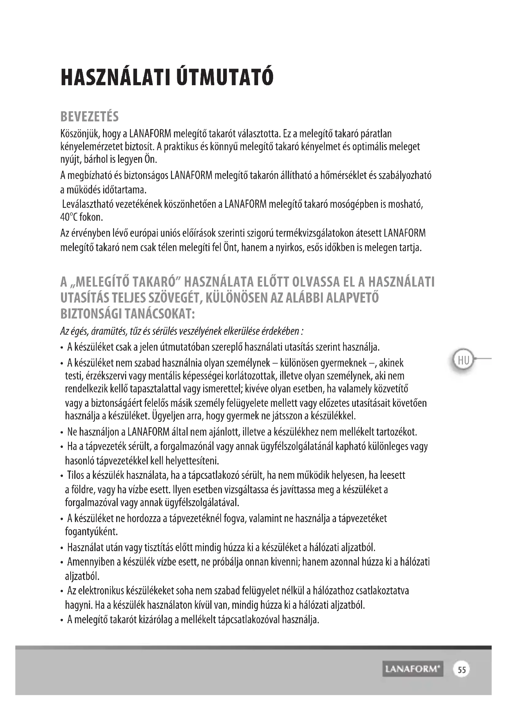 BEVEZETÉS Köszönjük, hogy a LANAFORM melegítő takarót választotta. Ez a melegítő takaró páratlan kényelemérzetet biztosít. A praktikus és könnyű melegítő takaró kényelmet és optimális meleget nyújt, bárhol is legyen Ön. A megbízható és biztonságos LANAFORM melegítő takarón állítható a hőmérséklet és szabályozható a működés időtartama. Leválasztható vezetékének köszönhetően a LANAFORM melegítő takaró mosógépben is mosható, 40°C fokon. Az érvényben lévő európai uniós előírások szerinti szigorú termékvizsgálatokon átesett LANAFORM melegítő takaró nem csak télen melegíti fel Önt, hanem a nyirkos, esős időkben is melegen tartja. A „MELEGÍTŐ TAKARÓ” HASZNÁLATA ELŐTT OLVASSA EL A HASZNÁLATI UTASÍTÁS TELJES SZÖVEGÉT, KÜLÖNÖSEN AZ ALÁBBI ALAPVETŐ BIZTONSÁGI TANÁCSOKAT: Az égés, áramütés, tűz és sérülés veszélyének elkerülése érdekében :