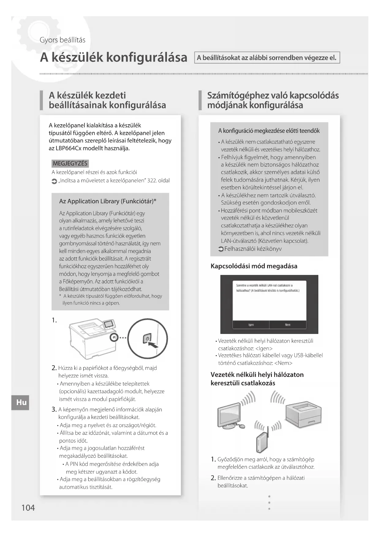 Hr103 BilješkeSzámítógéphez való kapcsolódás módjának konfigurálása Az Application Library (Funkciótár)* AzApplicationLibrary(Funkciótár)egyolyan alkalmazás, amely lehetővé teszi a rutinfeladatok elvégzésére szolgáló, vagy egyéb hasznos funkciók egyetlen gombnyomással történő használatát, így nem kell minden egyes alkalommal megadnia az adott funkciók beállításait. A regisztrált funkciókhoz egyszerűen hozzáférhet oly módon, hogy lenyomja a megfelelő gombot a Főképernyőn. Az adott funkciókról a Beállítási útmutatóban tájékozódhat.* A készülék típusától függően előfordulhat, hogy ilyen funkció nincs a gépen.