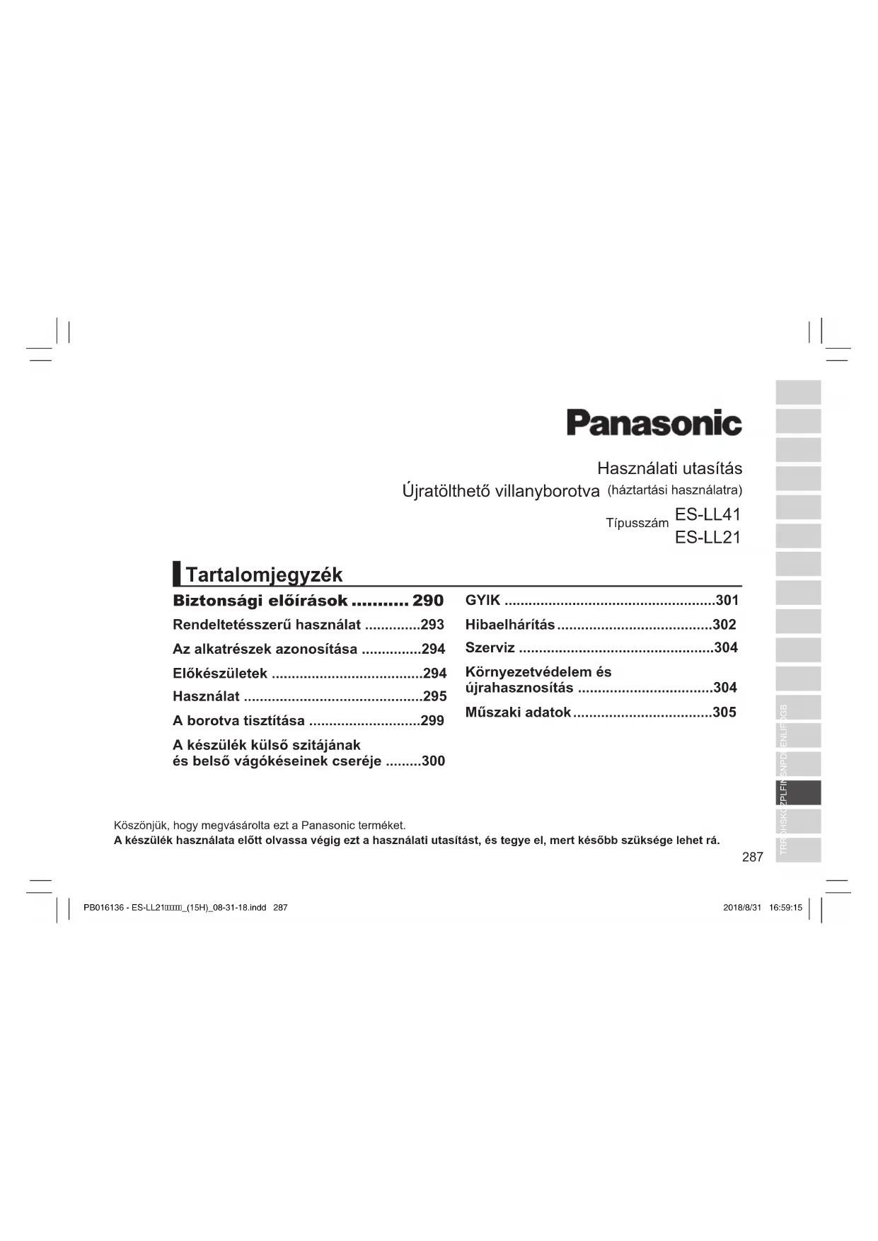- Műszaki adatok Tartalomjegyzék Köszönjük, hogy megvásárolta ezt a Panasonic terméket. A készülék használata előtt olvassa végig ezt a használati utasítást, és tegye el, mert később szüksége lehet rá. PB016136 - ES-LL21_(15H)_08-31-18.indd 287 2018/8/31 16:59:15288 Vigyázat p. 305