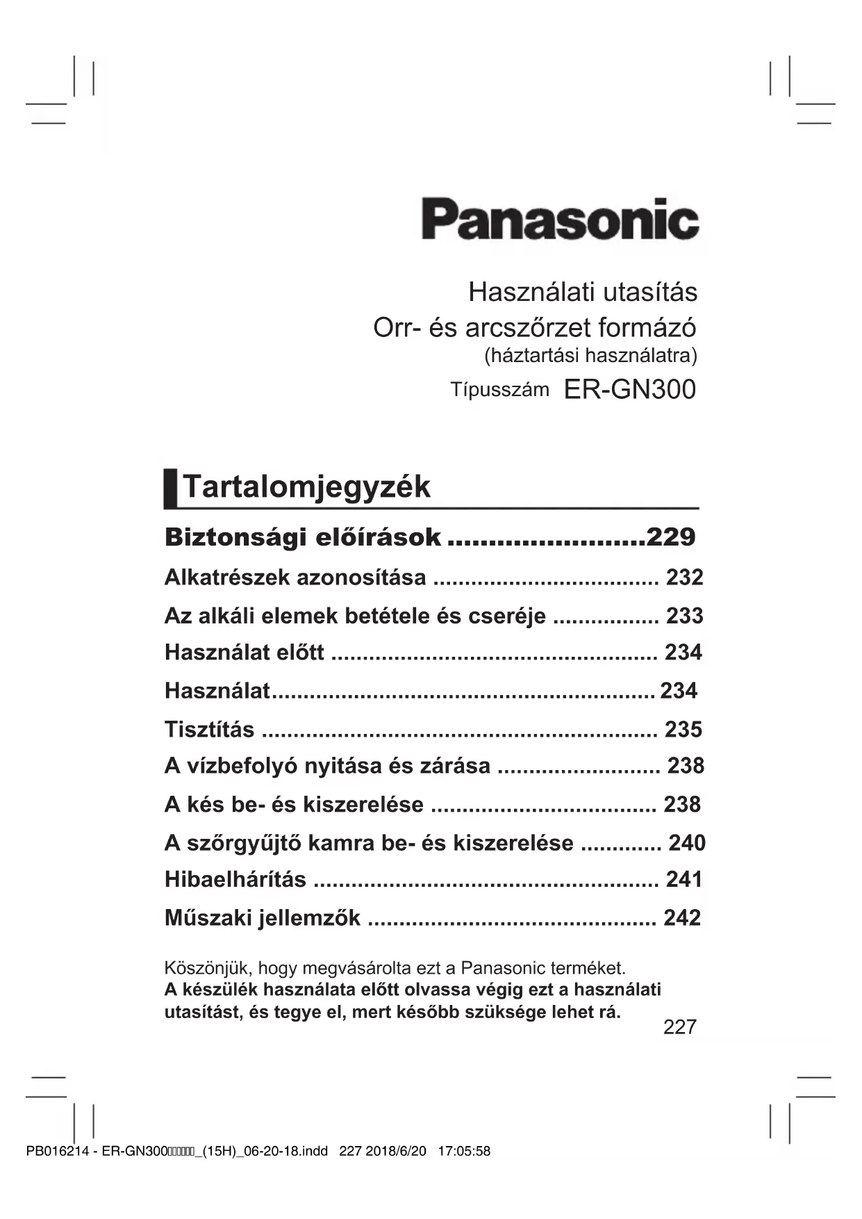 - Műszaki jellemzők PB016214 - ER-GN300_(15H)_06-20-18.indd 227 2018/6/20 17:05:58228 Figyelem p. 242