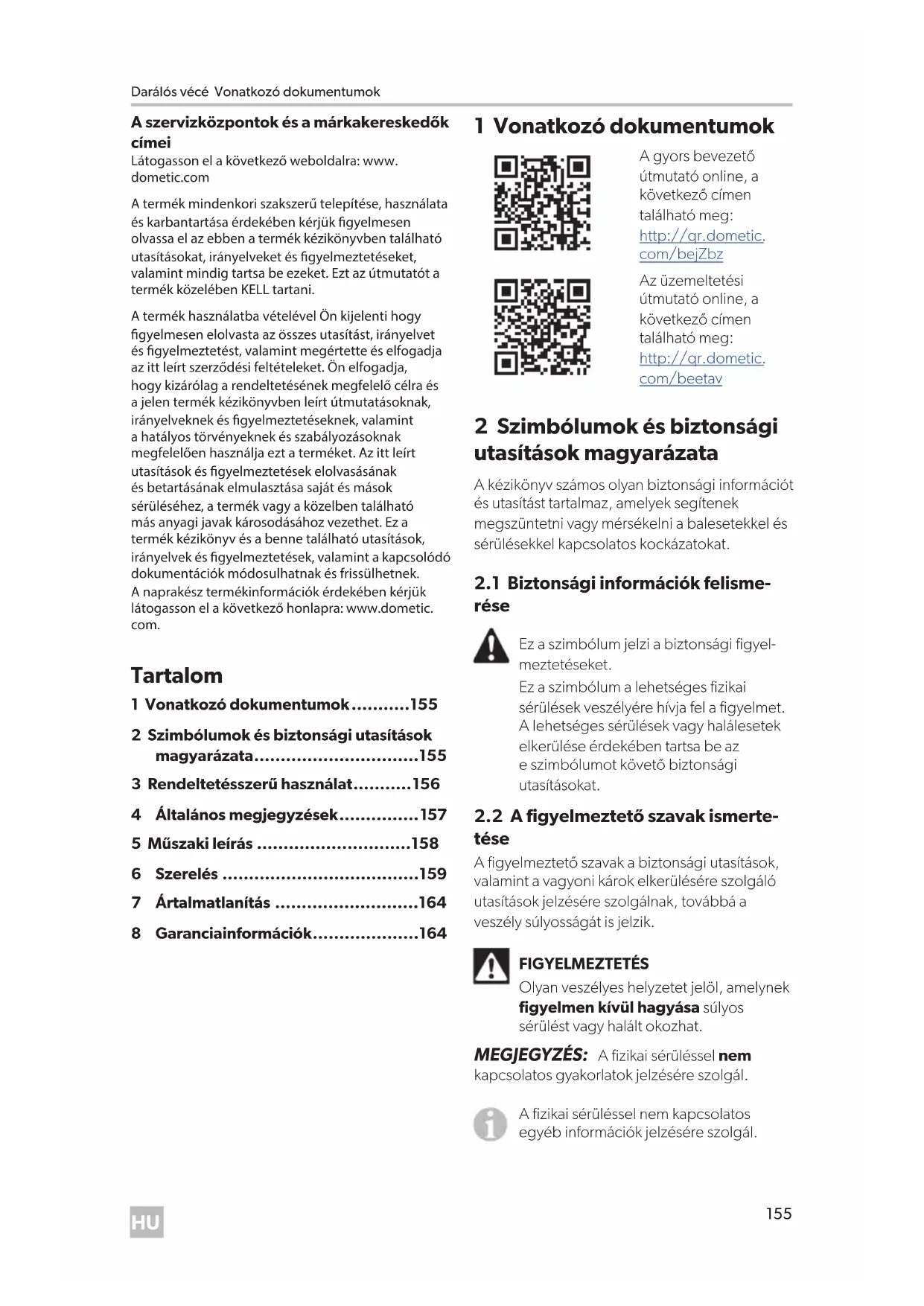 - 8 Garanciainformációk 1 Vonatkozó dokumentumok A gyors bevezető útmutató online, a következő címen található meg: http://qr.dometic. com/bejZbz Az üzemeltetési útmutató online, a következő címen található meg: http://qr.dometic. com/beetav 2 Szimbólumok és biztonsági utasítások magyarázata A kézikönyv számos olyan biztonsági információt és utasítást tartalmaz, amelyek segítenek megszüntetni vagy mérsékelni a balesetekkel és sérülésekkel kapcsolatos kockázatokat. p. 164