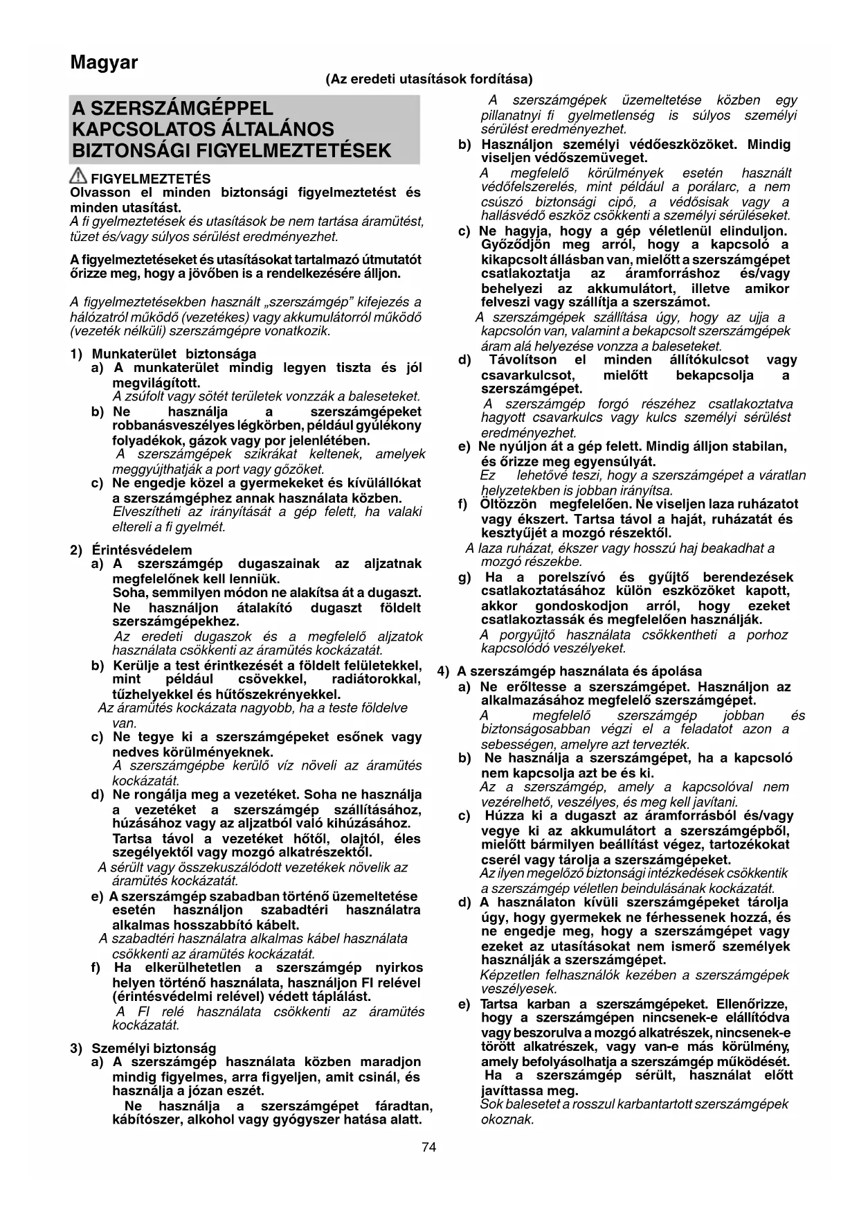 a) A szerszámgép használata közben maradjon mindig fi gyelmes, arra fi gyeljen, amit csinál, és használja a józan eszét. Ne használja a szerszámgépet fáradtan, kábítószer, alkohol vagy gyógyszer hatása alatt. (Az eredeti utasítások fordítása) 0000BookG10SS2.indb740000BookG10SS2.indb74 2017/12/0413:45:092017/12/0413:45:0975 Magyar f) A vágószerszámokat tartsa élesen és tisztán. Az éles vágóélekkel rendelkező, megfelelően karbantartott vágószerszámok kevésbé valószínű, hogy elakadnak, és könnyebben kezelhetők.