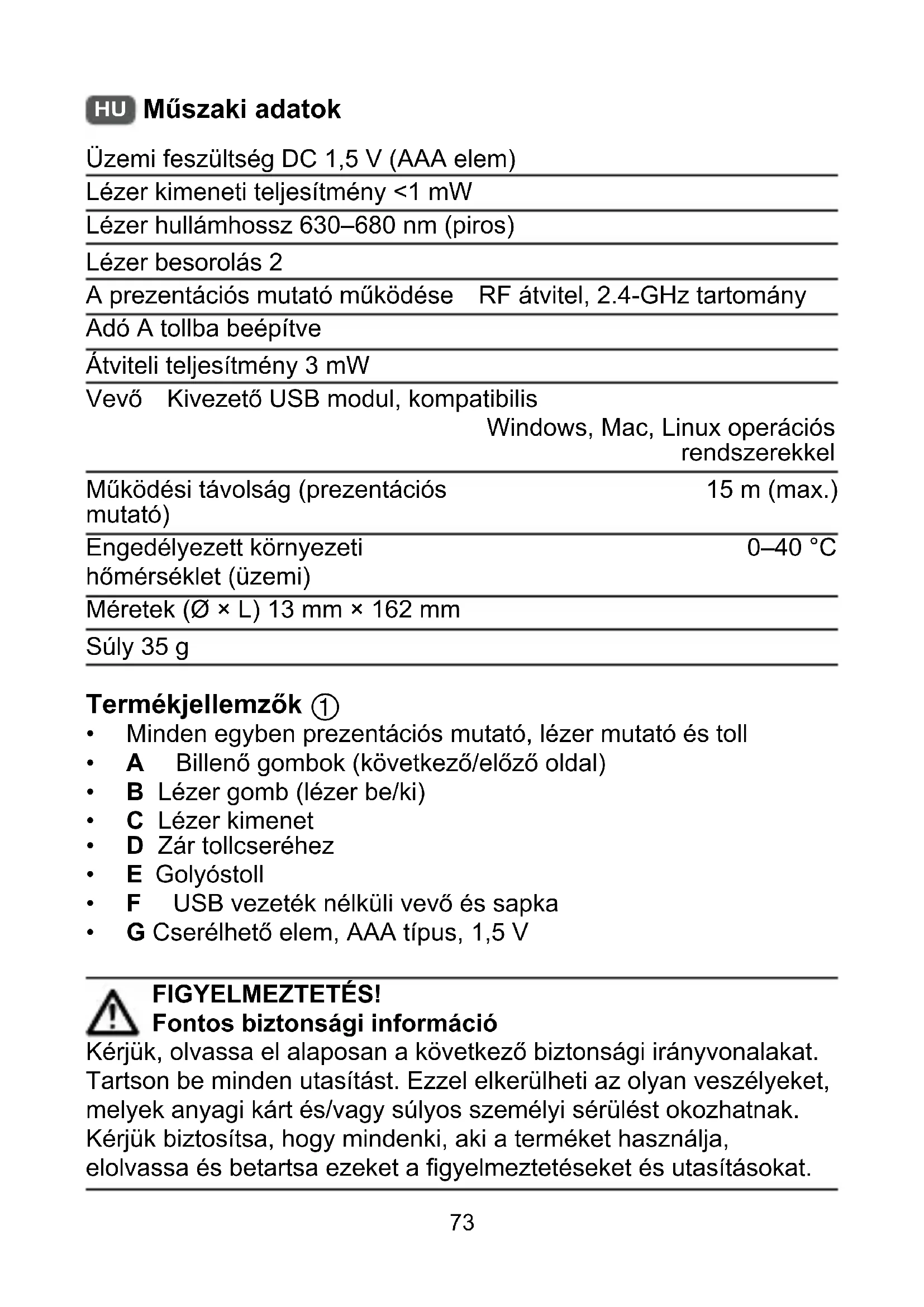 Műszaki adatok Üzemi feszültség DC 1,5 V (AAA elem) Lézer kimeneti teljesítmény <1 mW Lézer hullámhossz 630–680 nm (piros) Lézer besorolás 2 Aprezentációsmutatóműködése RF átvitel, 2.4-GHz tartomány Adó A tollba beépítve Átviteli teljesítmény 3 mW Vevő KivezetőUSBmodul,kompatibilis Windows, Mac, Linux operációs rendszerekkel Működésitávolság(prezentációs mutató) 15 m (max.) Engedélyezett környezeti hőmérséklet(üzemi) 0–40 °C Méretek (Ø × L) 13 mm × 162 mm Súly 35 g Termékjellemzők