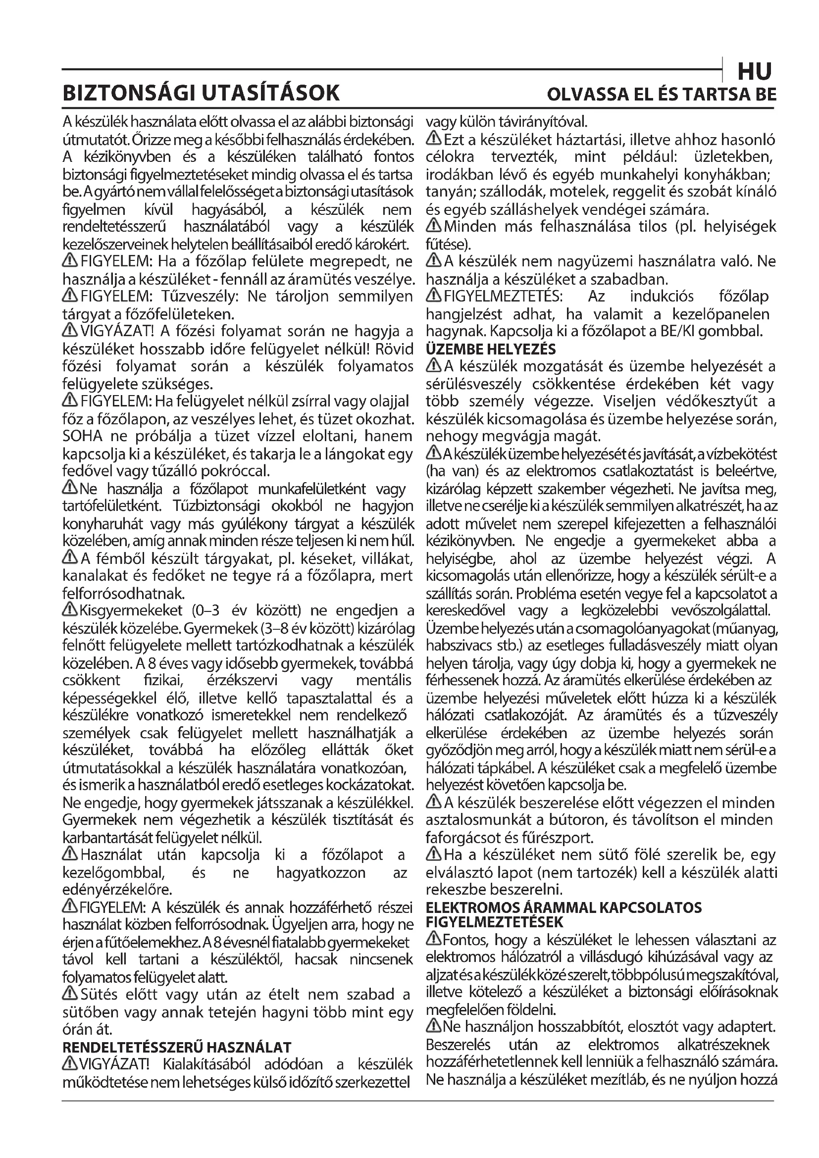 VIGYÁZAT! Kialakításából adódóan a készülék működtetése nem lehetséges külső időzítő szerkezettel vagy külön távirányítóval. Ezt a készüléket háztartási, illetve ahhoz hasonló célokra tervezték, mint például: üzletekben, irodákban lévő és egyéb munkahelyi konyhákban; tanyán; szállodák, motelek, reggelit és szobát kínáló és egyéb szálláshelyek vendégei számára. Minden más felhasználása tilos (pl. helyiségek fűtése). A készülék nem nagyüzemi használatra való. Ne használja a készüléket a szabadban. FIGYELMEZTETÉS: Az indukciós főzőlap hangjelzést adhat, ha valamit a kezelőpanelen hagynak. Kapcsolja ki a főzőlapot a BE/KI gombbal.