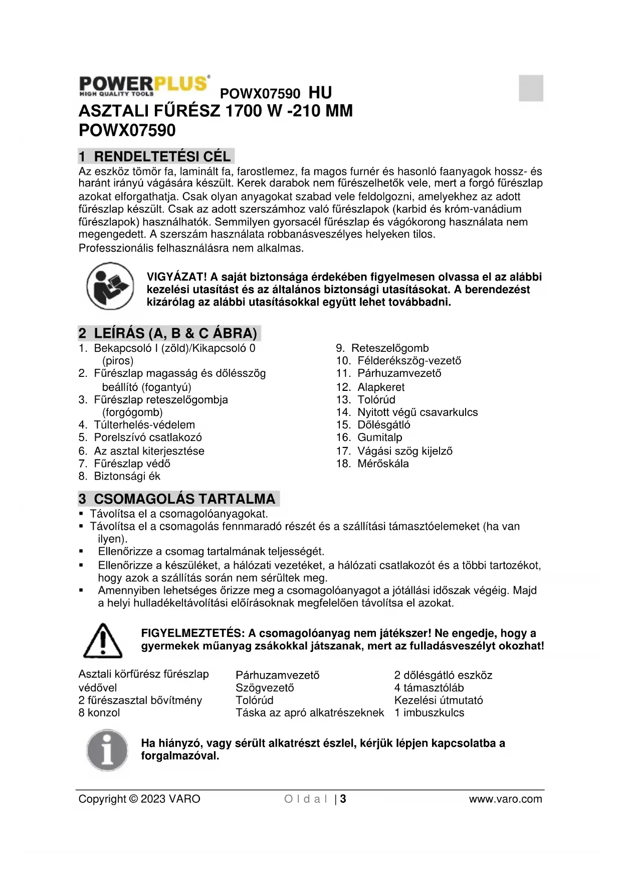 Sérülésveszély! Mielőtt bármilyen karbantartást végezne, gondoskodjon arról, hogy az eszköz ki legyen húzva a konnektorból! Sérülésveszély! A fűrész használata után a fűrészlap egy ideig még igen forró lehet. Hagyja lehűlni! Gyúlékony folyadékot semmilyen esetben se használjon a tisztításhoz! Az álló fűrészlap is okozhat sérülést! A fűrészlap cseréjét kesztyűben végezze!POWX07590 HU Copyright © 2023 VARO O l d a l | 14 www.varo.com