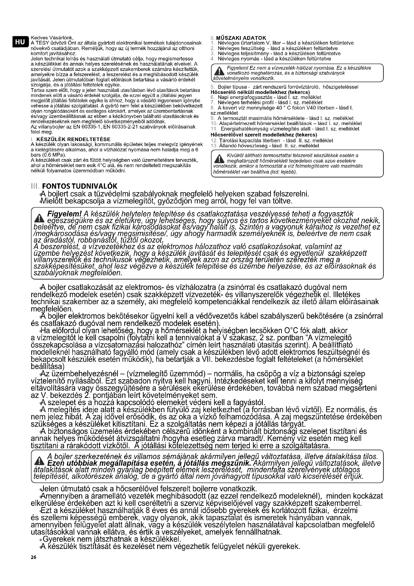 Kedves Vásárlónk, A TESY üdvözli Önt az általa gyártott elektronikai termékek tulajdonosainak növekvő családjában. Reméljük, hogy az új termék hozzájárul az otthoni komfort javításához. Jelen technikai leírás és használati útmutató célja, hogy megismertesse a készülékkel és annak helyes szerelésének és használatának elveivel. A szerelési útmutatót azok a szakképzett szakemberek számára készítettük, amelyekre bízza a felszerelést, a leszerelést és a meghibásodott készülék javítását. Jelen útmutatóban foglalt előírások betartása a vásárló érdekét szolgálja, és a jótállási feltételek egyike. Tartsa szem előtt, hogy a jelen használati utasításban lévő utasítások betartása mindenek előtt a vásárló érdekét szolgálja, de ezzel együtt a jótállási jegyen megjelölt jótállási feltételek egyike is ahhoz, hogy a vásárló ingyenesen igénybe vehesse a jótállási szolgáltatást. A gyártó nem felel a készülékben bekövetkezett olyan rongálódásokért és esetleges károkért, amelyek az üzembentartásnak és/vagy üzembeállításnak az ebben a kézikönyvben található utasításoknak és rendelkezéseknek nem megfelelő következményeiből adódnak. Az villanybojler az EN 60335-1, EN 60335-2-21 szabványok előírásainak felel meg.