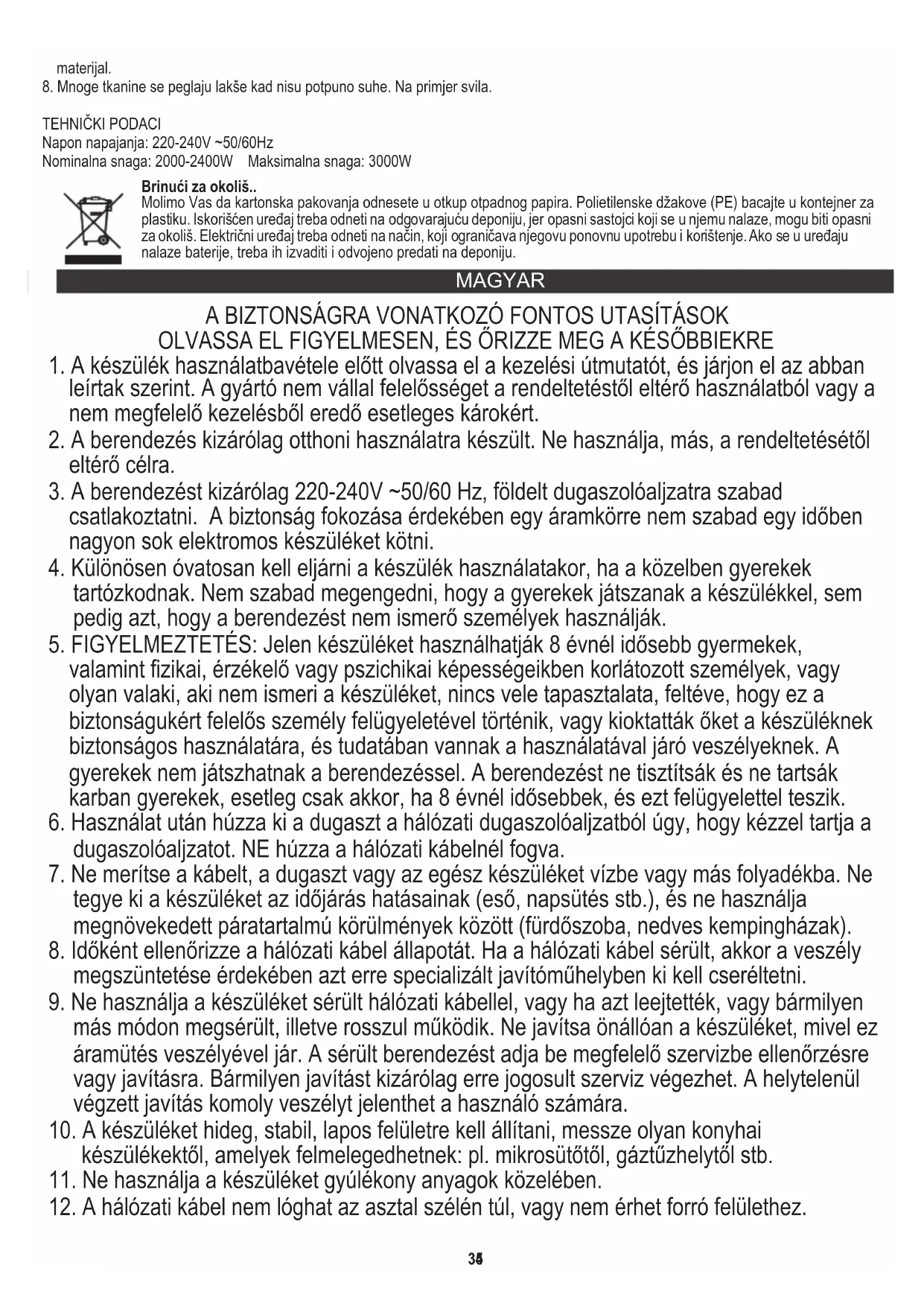 3. A berendezést kizárólag 220-240V ~50/60 Hz, földelt dugaszolóaljzatra szabad