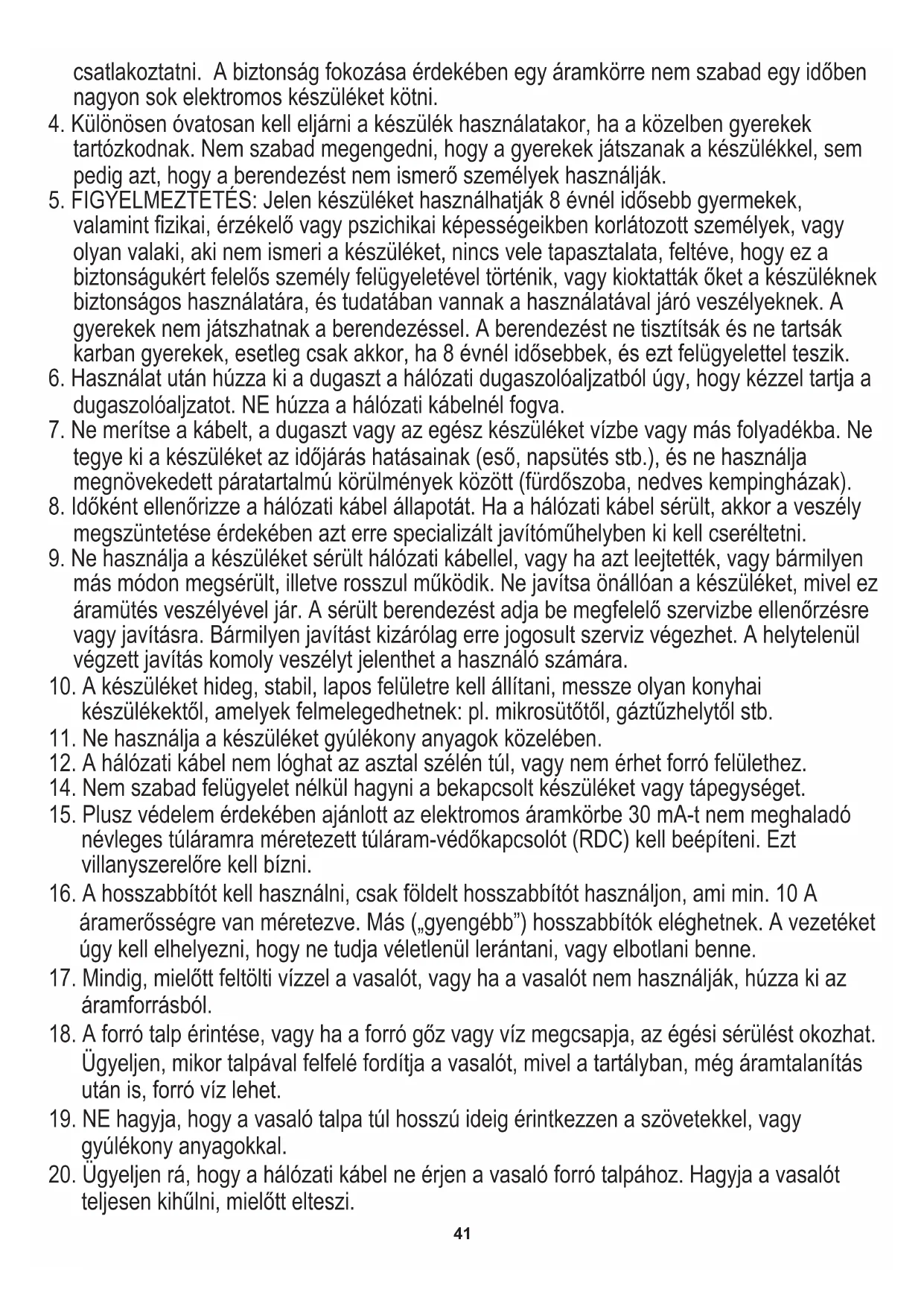 valamint fizikai, érzékelő vagy pszichikai képességeikben korlátozott személyek, vagy olyan valaki, aki nem ismeri a készüléket, nincs vele tapasztalata, feltéve, hogy ez a biztonságukért felelős személy felügyeletével történik, vagy kioktatták őket a készüléknek biztonságos használatára, és tudatában vannak a használatával járó veszélyeknek. A gyerekek nem játszhatnak a berendezéssel. A berendezést ne tisztítsák és ne tartsák karban gyerekek, esetleg csak akkor, ha 8 évnél idősebbek, és ezt felügyelettel teszik.
