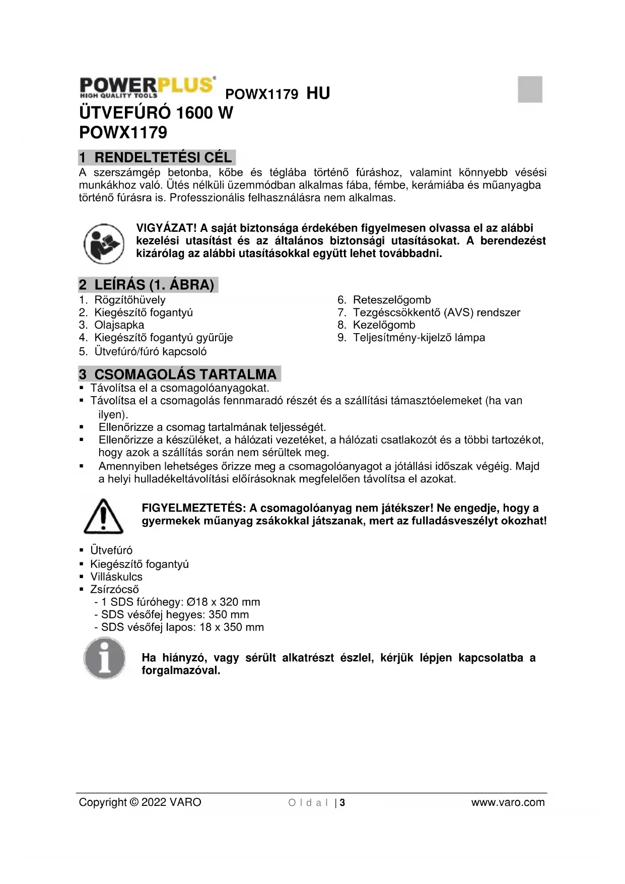 Ha a gép elhasználódott, ne dobja a háztartási szemétbe, hanem gondoskodjon annak környezetbarát elhelyezéséről! Az elhasználódott elektromos termékek hulladékait ne dobja a háztartási szemétbe. Kérjük, hogy gondoskodjon azok újrahasznosításáról, amennyiben erre lehetősége van. Az újrahasznosítási lehetőségeket illetően érdeklődjön a helyi köztisztasági szerveknél vagy a forgalmazónál!POWX1179 HU Copyright © 2022 VARO O l d a l | 11 www.varo.com
