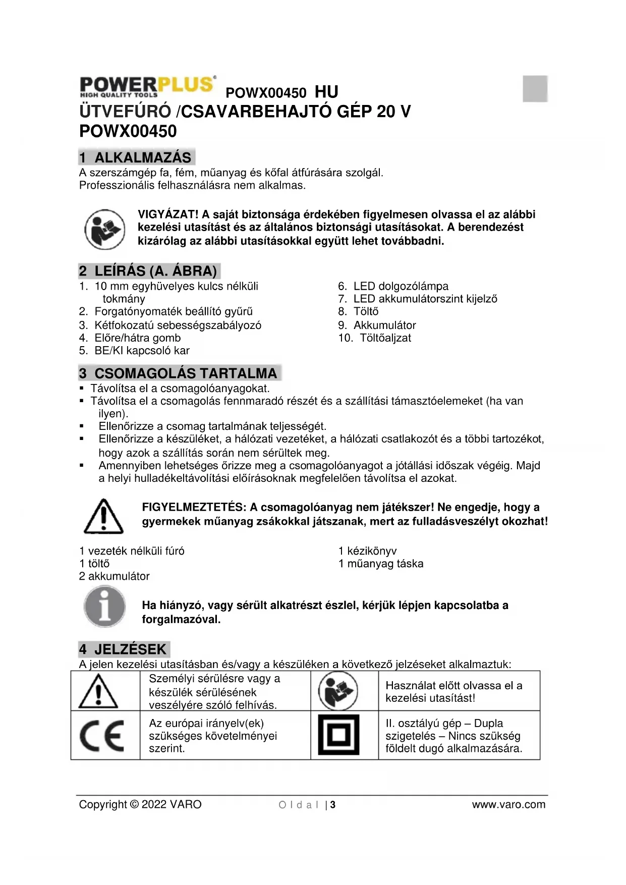 szigetelés – Nincs szükség földelt dugó alkalmazására.POWX00450 HU Copyright © 2022 VARO Oldal | 4 www.varo.com