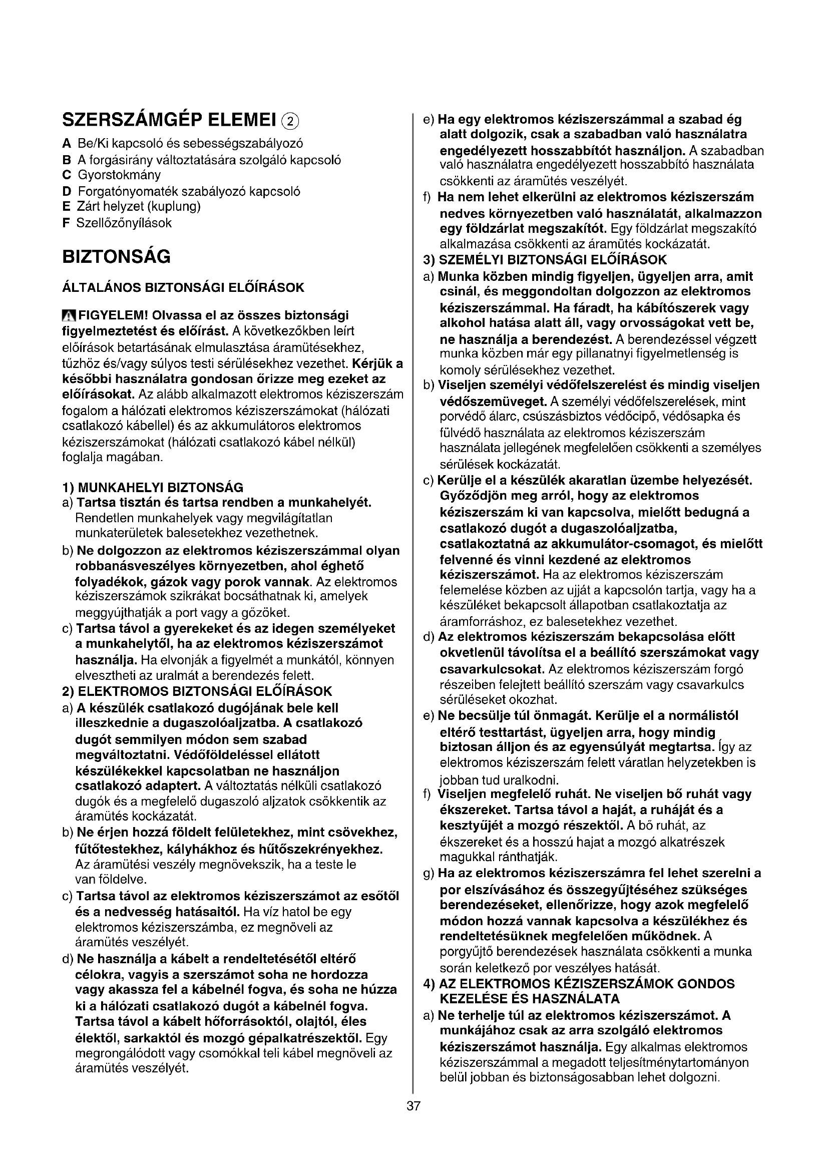 A Be/Ki kapcsoló és sebességszabályozó B A forgásirány változtatására szolgáló kapcsoló C Gyorstokmány D Forgatónyomaték szabályozó kapcsoló E Zárt helyzet (kuplung) F Szellőzőnyílások BIZTONSÁG ÁLTALÁNOS BIZTONSÁGI ELŐÍRÁSOK FIGYELEM! Olvassa el az összes biztonsági figyelmeztetéstéselőírást. A következőkben leírt előírások betartásának elmulasztása áramütésekhez, tűzhöz és/vagy súlyos testi sérülésekhez vezethet. Kérjük a későbbihasználatragondosanőrizzemegezeketaz előírásokat. Az alább alkalmazott elektromos kéziszerszám fogalom a hálózati elektromos kéziszerszámokat (hálózati csatlakozó kábellel) és az akkumulátoros elektromos kéziszerszámokat (hálózati csatlakozó kábel nélkül) foglalja magában.