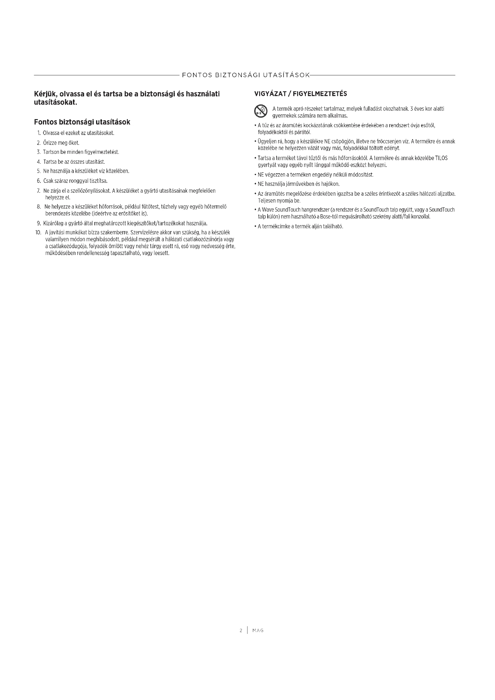 védjegye. A Windows a Microsoft Corporation bejegyzett védjegye az Egyesült Államokban és más országokban. A Bose, a SoundTouch, s vezeték nélküli hangjegy ábrája, a Wave és a Wave hangrendszerek jól megkülönböztethető kialakítása a Bose Corporation védjegye. Bose Corporation központja: 1-877-230-5639 © 2018 Bose Corporation. Előzetes írásos engedély nélkül a jelen kiadvány semmilyen része nem sokszorosítható, módosítható, terjeszthető, illetve nem használható fel semmilyen más módon.TARTALOM