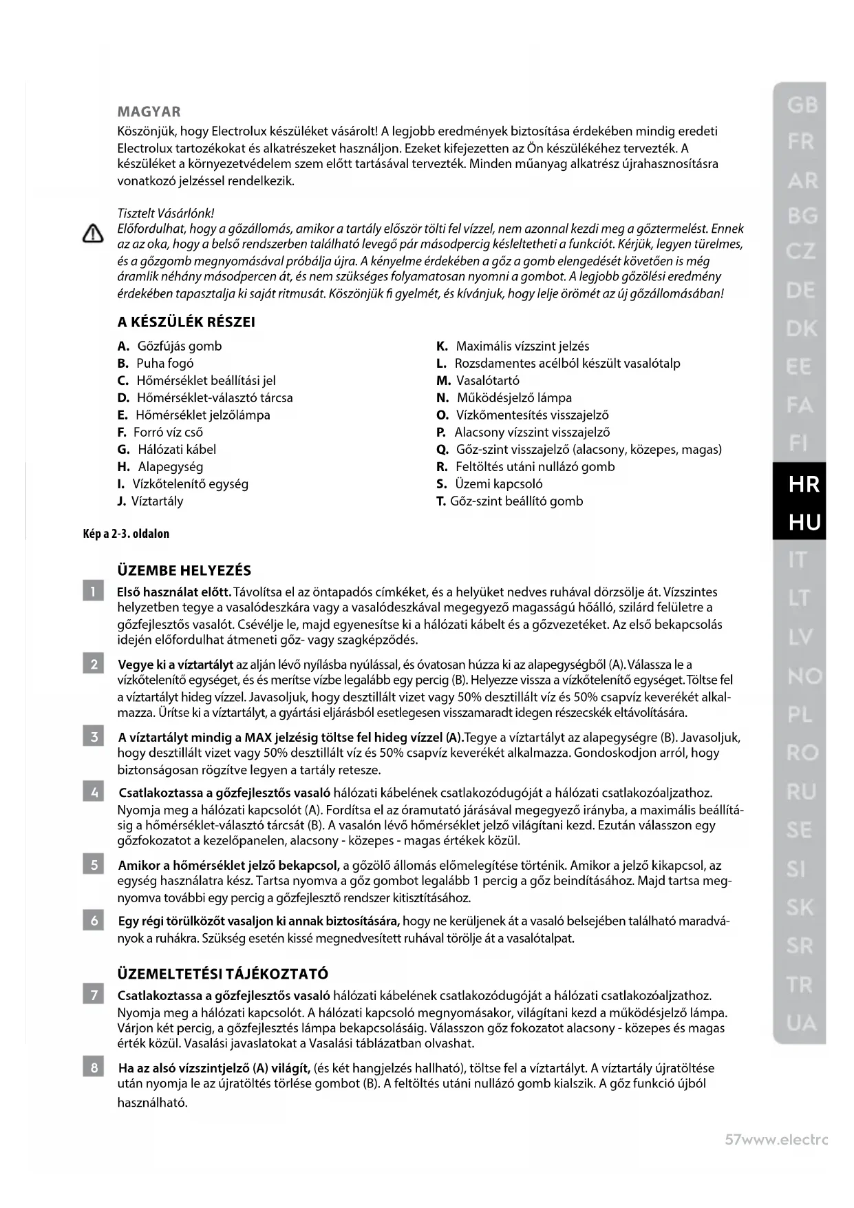 MAGYAR Köszönjük, hogy Electrolux készüléket vásárolt! A legjobb eredmények biztosítása érdekében mindig eredeti Electrolux tartozékokat és alkatrészeket használjon. Ezeket kifejezetten az Ön készülékéhez tervezték. A készüléket a környezetvédelem szem előtt tartásával tervezték. Minden műanyag alkatrész újrahasznosításra vonatkozó jelzéssel rendelkezik. Tisztelt Vásárlónk! Előfordulhat, hogy a gőzállomás, amikor a tartály először tölti fel vízzel, nem azonnal kezdi meg a gőztermelést. Ennek az az oka, hogy a belső rendszerben található levegő pár másodpercig késleltetheti a funkciót. Kérjük, legyen türelmes, és a gőzgomb megnyomásával próbálja újra. A kényelme érdekében a gőz a gomb elengedését követően is még áramlik néhány másodpercen át, és nem szükséges folyamatosan nyomni a gombot. A legjobb gőzölési eredmény érdekében tapasztalja ki saját ritmusát. Köszönjük gyelmét, és kívánjuk, hogy lelje örömét az új gőzállomásában! A KÉSZÜLÉK RÉSZEI A. Gőzfújás gomb B. Puha fogó C. Hőmérséklet beállítási jel D. Hőmérséklet-választó tárcsa E. Hőmérséklet jelzőlámpa F. Forró víz cső G. Hálózati kábel H. Alapegység І. Vízkőtelenítő egység J. Víztartály K. Maximális vízszint jelzés L. Rozsdamentes acélból készült vasalótalp M. Vasalótartó N. Működésjelző lámpa O. Vízkőmentesítés visszajelző P. Alacsony vízszint visszajelző Q. Gőz-szint visszajelző (alacsony, közepes, magas) R. Feltöltés utáni nullázó gomb S. Üzemi kapcsoló T. Gőz-szint beállító gomb Kép a 2-3. oldalon