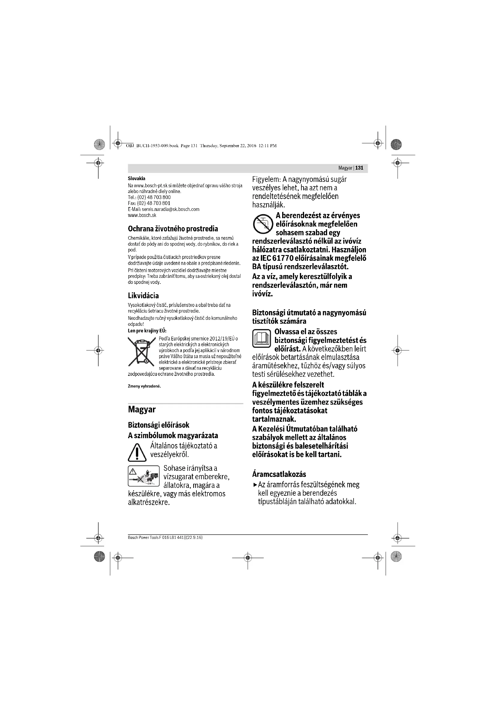 Súly az „EPTA-Procedure 01:2014” (01:2014 EPTA-eljárás) szerint kg 6,65/8,12 7,83/8,82 8,9 Érintésvédelmi osztály /II /II /II Gyári szám Lásd a nagynyomású tisztítón elhelyezett gyári számot (típustábla) Az adatok [U] = 230 V névleges feszültségre vonatkoznak. Ettől eltérő feszültségek esetén és az egyes országok számára készült különleges kivitelekben ezek az adatok változhatnak. A bekapcsolási folyamatok rövid időtartamú feszültségcsökkenést okoznak. Hátrányos hálózati viszonyok esetén ez negatív hatással lehet más berendezések működésére. Ha a hálózati impedancia alacsonyabb, mint 0,153 Ω nem kell hálózati zavarokra számítani. OBJ_BUCH-1953-009.book Page 135 Thursday, September 22, 2016 12:11 PM136 | Magyar F 016 L81 441 | (22.9.16) Bosch Power Tools Zaj és vibráció értékek Felszerelés és üzemeltetés Üzembe helyezés Az Ön biztonságáért Figyelem! A berendezés karbantartása vagy tisztítása előtt kapcsolja ki a berendezést és húzza ki a hálózati csatlakozó dugót. Ugyanez érvényes azokra az esetekre is, amikor a hálózati csatlakozó kábel megrongálódott, belevágtak, vagy beakadt valamibe. Az üzemi feszültség 230 V AC, 50 Hz (az EU-n kívüli országokban a kiviteltől függően 220 V, 240 V). Csak engedélyezett hosszabbító kábelt használjon. További információkat az erre feljogosított vevőszolgálattól kaphat. Ha a nagynyomású tisztító üzemeltetéséhez egy hosszabbító kábelt használ, akkor a következő vezeték keresztmetszetekre van szükség: – 1,5mm
