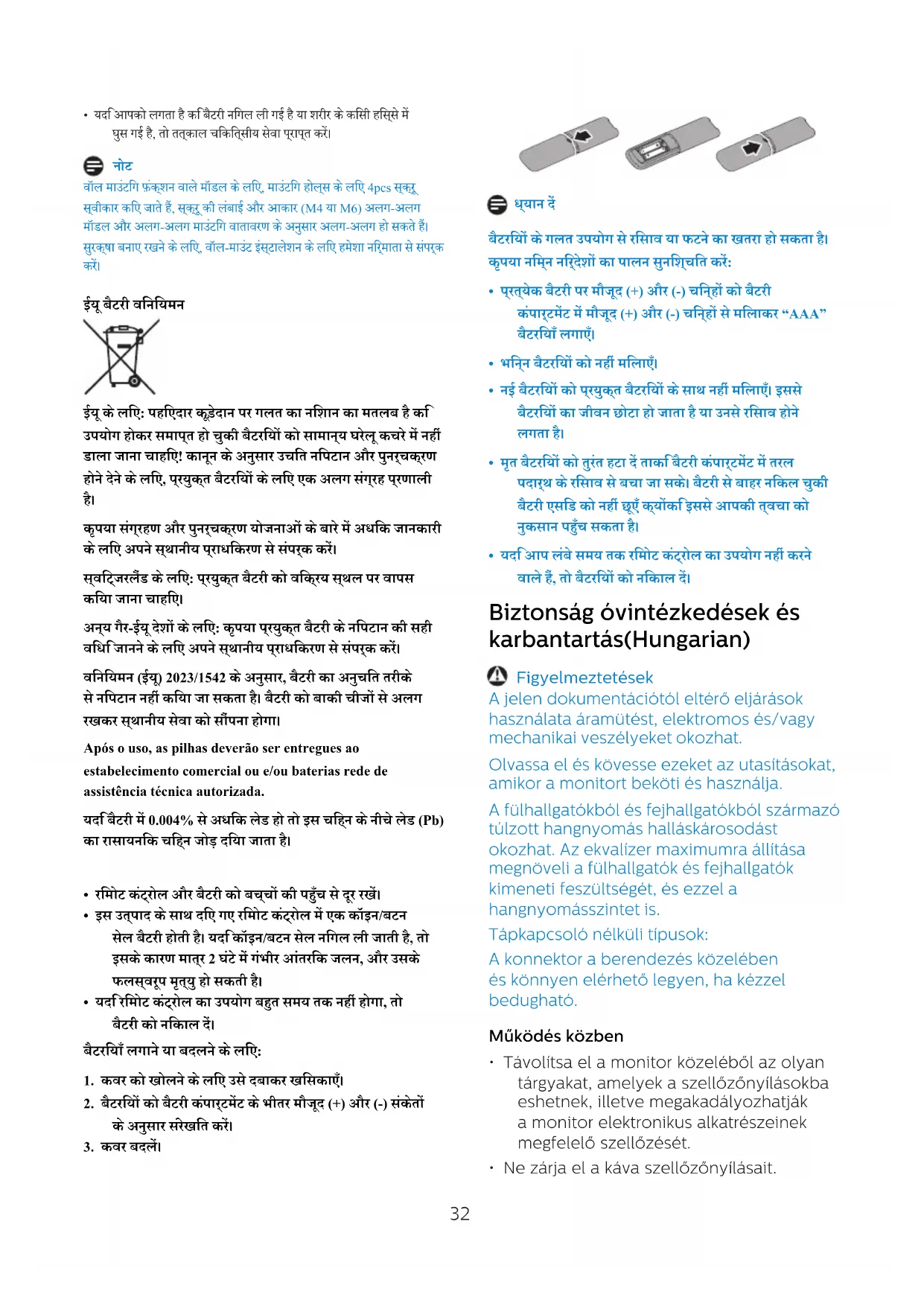 - Ha úgy gondolja, hogy az elemet lenyelték vagy testbe jutott, azonnal forduljon orvoshoz. Megjegyzés A falra szerelhető típusok esetében 4 db csavar fogadható el a rögzítőfuratokhoz, a csavar hossza és mérete (M4 vagy M6) eltérő lehet a különböző típusok és a különböző szerelési környezetek szerint. A biztonság fenntartása érdekében mindig lépjen kapcsolatba a gyártóval a falra szereléshez. Az Európai Unió akkumulátorokra vonatkozó rendelete EU esetén: Az áthúzott szemetes azt jelzi, hogy a használt akkumulátorokat34 tilos háztartási hulladékba dobni! A használt akkumulátorok számára egy külön gyűjtőrendszer létezik, amely lehetővé teszi a jogszabályoknak megfelelő kezelést és újrahasznosítást. A gyűjtési és újrahasznosítási módokról érdeklődjön a helyi hatóságnál. Svájc esetén: A használt elemet a vásárlás helyére kell visszavinni. Más, EU-n kívüli országok esetén: A használt elemek helyes hulladékkezeléséről érdeklődjön a helyi hatóságnál. A 2023/1542 EU rendelet értelmében az elemek ártalmatlanítása nem történhet meg helytelenül. Az elemeket külön kell gyűjteni a helyi szolgáltató számára. Após o uso, as pilhas deverão ser entregues ao estabelecimento comercial ou e/ou baterias rede de assistência técnica autorizada. Ha az akkumulátor(ok) 0,004 %-nál több ólmot tartalmaz(nak), a szimbólum alatt az ólom (Pb) kémiai jelét kell feltüntetni.